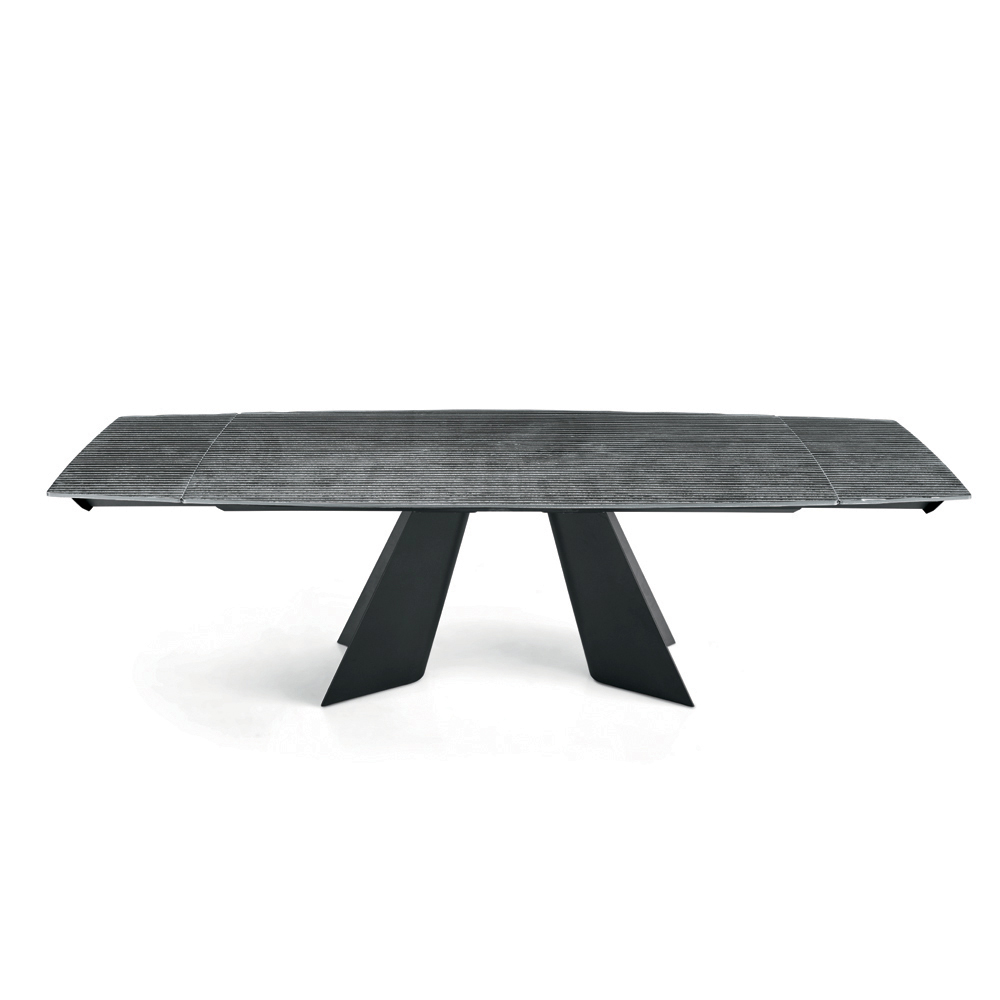 Charakterystyczna , malowana metalowa podstawa składa się z dwóch smukłych, łagodnie wygiętych elementów w kształcie litery V, zwężających się ku górze, tworząc elegancką i dynamiczną konstrukcję. Taka konfiguracja nadaje stołowi wizualną lekkość, a jednocześnie zapewnia stabilność i solidność konstrukcji.