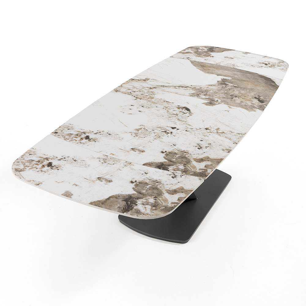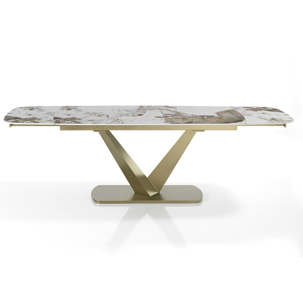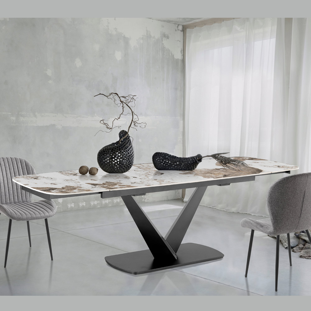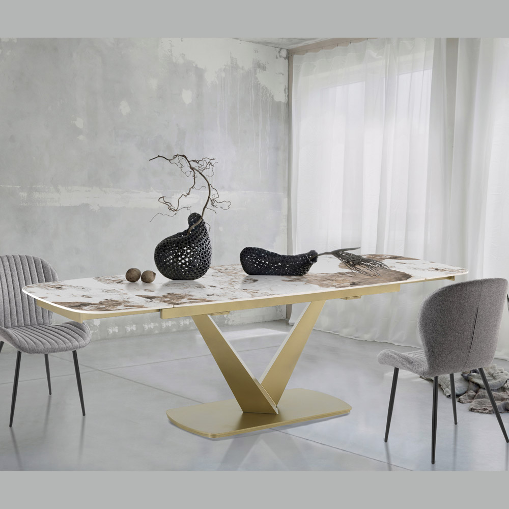 Ten rozkładany stół stanowi doskonałą syntezę elegancji i praktyczności . Ceramiczna powierzchnia z efektem marmuru i spektakularnymi żyłkami oferuje fascynującą paletę kolorów, która przyciąga wzrok, czyniąc ją prawdziwym dziełem sztuki. Podstawa w kształcie litery V nie tylko solidnie podtrzymuje blat, ale dodaje całemu projektowi odrobinę nowoczesnego luksusu .