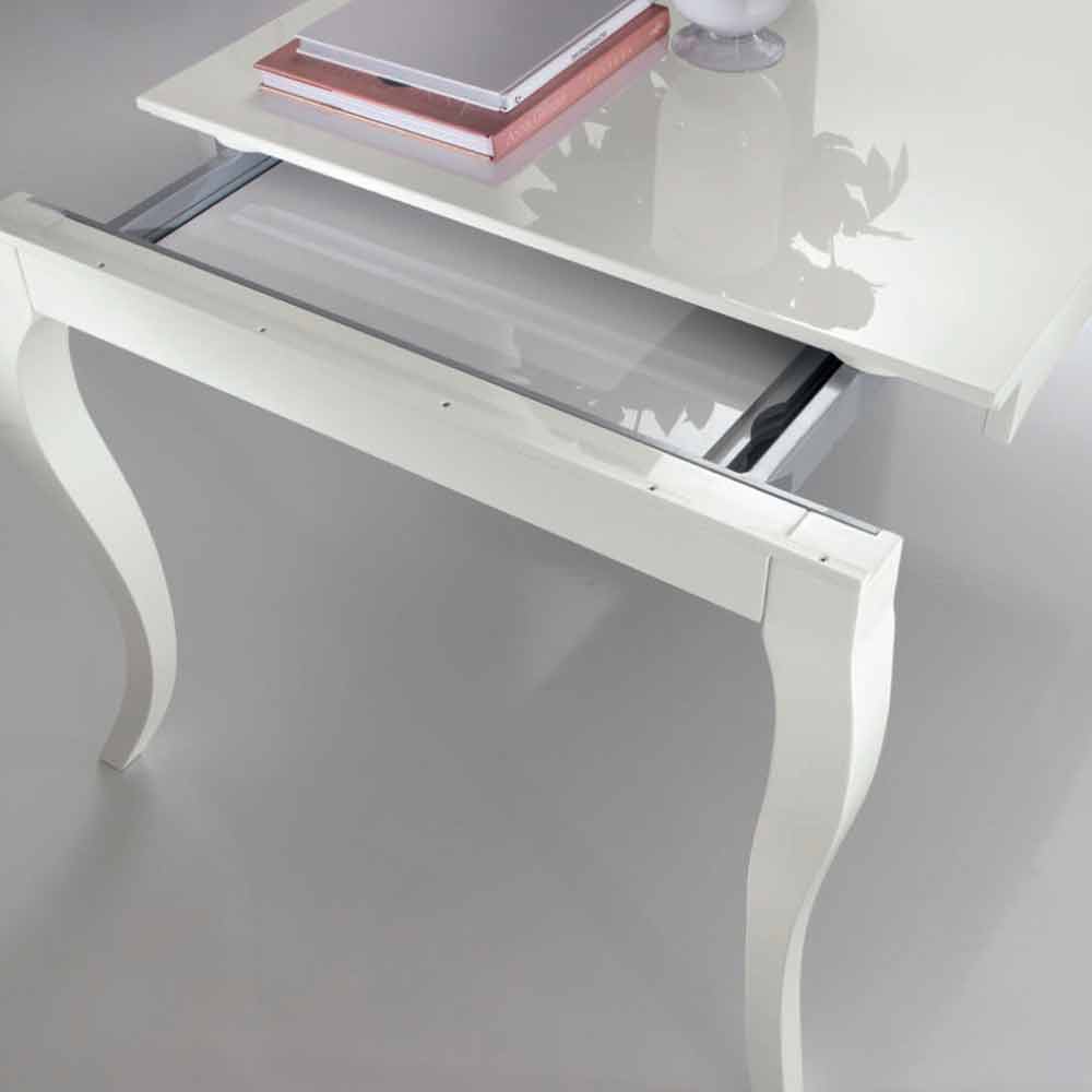 Rozkładany stół jadalny do 350 cm z błyszczącym białym blatem z drewna fornirowanego orzechem Tanganika i podstawą z litego drewna bukowego, wyprodukowaną we Włoszech.