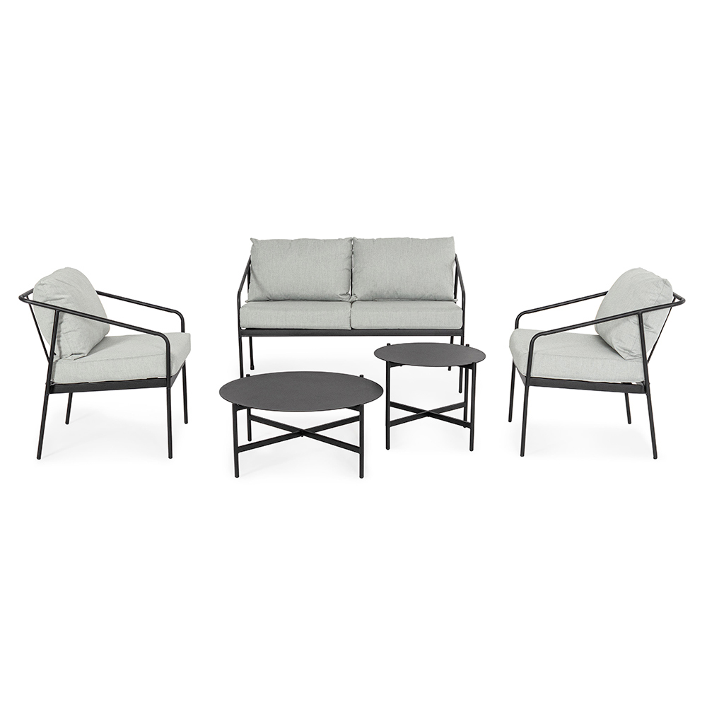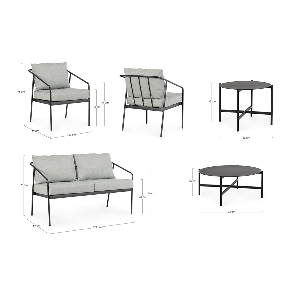 1 sofy, 2 stolików kawowych i 2 foteli. Ten zestaw wypoczynkowy do ogrodu to prawdziwa oda do nowoczesnego designu i komfortu na świeżym powietrzu . Każdy element, od pojedynczych foteli po dwuosobową sofę , został zaprojektowany tak, aby zapewnić niezrównane wrażenia relaksacyjne, dzięki miękkim poduszkom na siedziska i oparcia, które dopasowują się do każdego krajobrazu i stylu mebli ogrodowych. Stalowa konstrukcja jest solidna i zaprojektowana tak, aby wytrzymać upływ czasu, ale falisty kształt nadaje zestawowi wizualną lekkość, która poprawia otoczenie , nie obciążając go.
