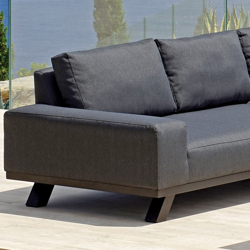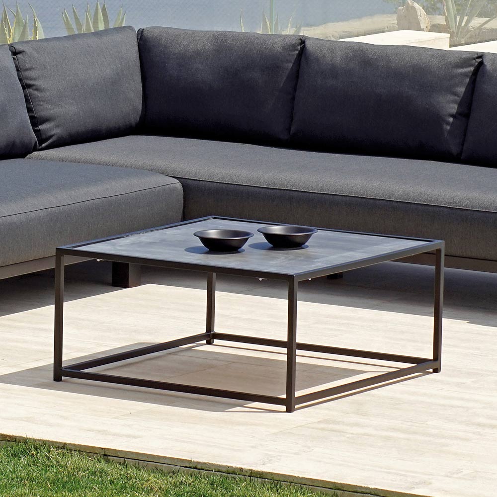 Salon ogrodowy z 2 sofami, czarną aluminiową konstrukcją i ceramicznym stolikiem kawowym.