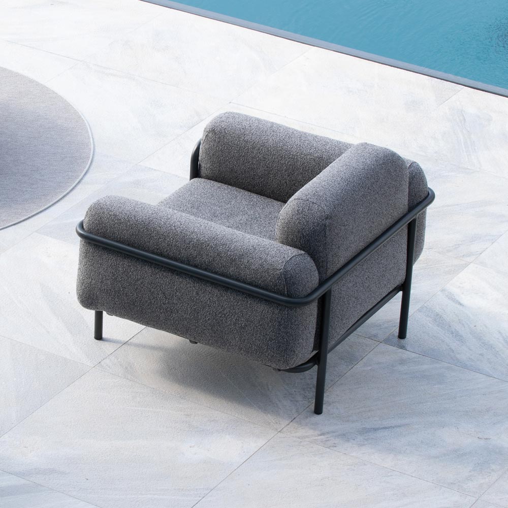 Zewnętrzny salon z tkaniną i ocynkowanym żelazem malowanym proszkowo, z sofą i 2 fotelami. Wyprodukowano we Włoszech.