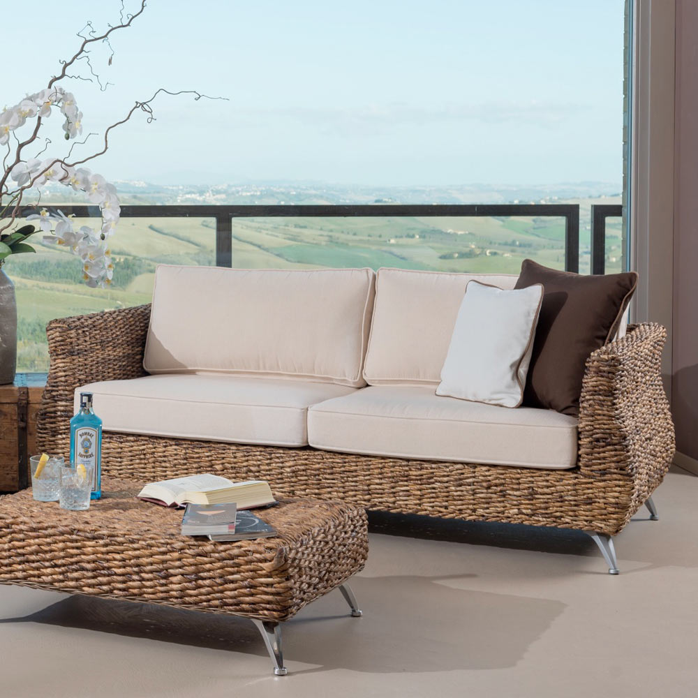 Salon zewnętrzny składający się z 2-osobowej sofy, 3-osobowej sofy i stolika kawowego z naturalnego, ręcznie plecionego drewna bananowca ze standardowymi poduszkami w zestawie w standardowym wykończeniu Ecru.