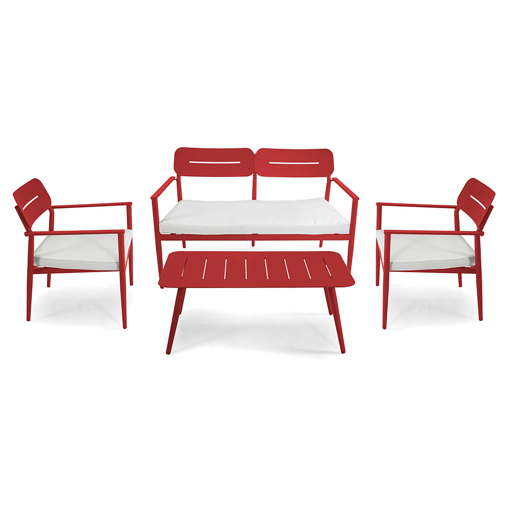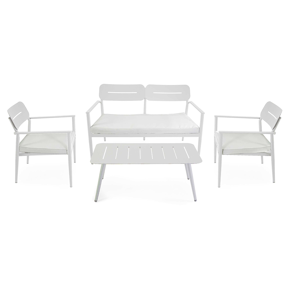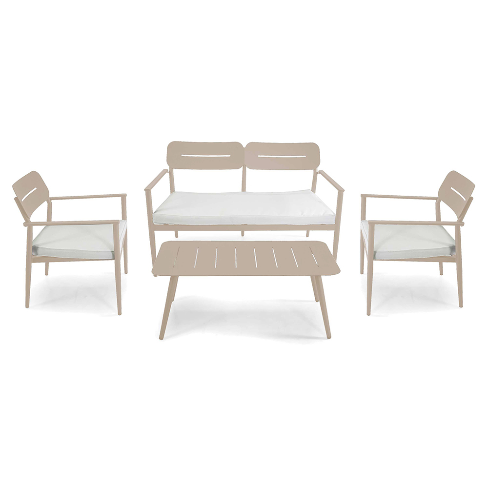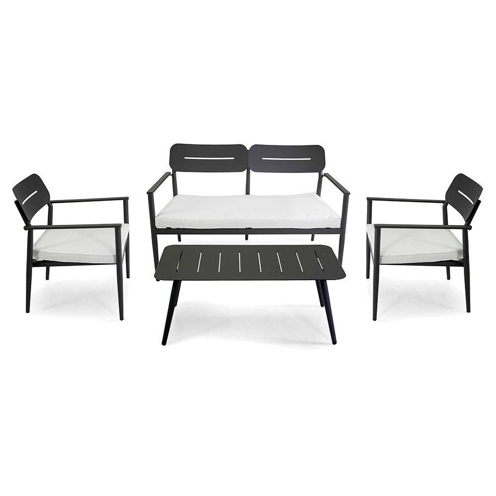 Ten salon zewnętrzny łączy w sobie funkcjonalność i nowoczesny styl, idealny dla tych, którzy chcą urządzić przestrzeń zewnętrzną ze smakiem. Aluminiowa rama jest zarówno elegancka, jak i wytrzymała, zapewniając długą żywotność i łatwą konserwację. Każdy element zestawu został zaprojektowany tak, aby zapewnić maksymalny komfort, od fotela z ergonomicznym oparciem, po przestronną sofę z miękkimi i zachęcającymi poduszkami.