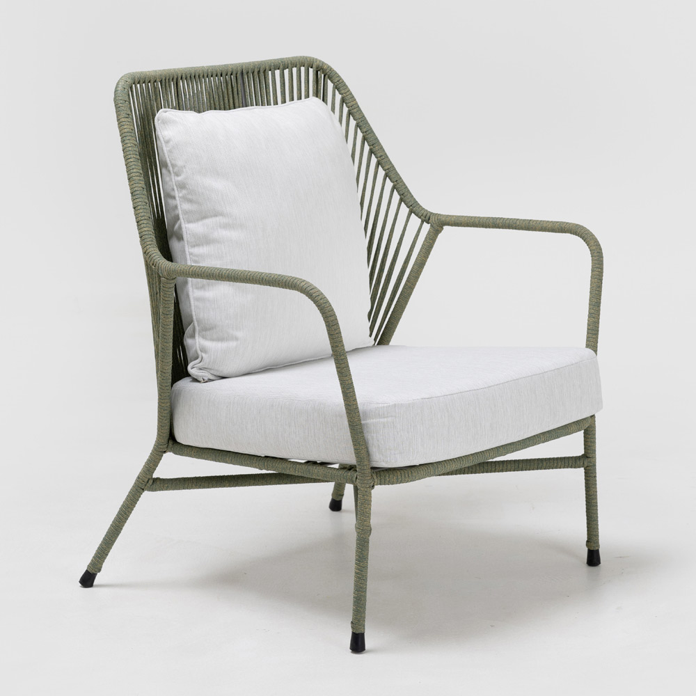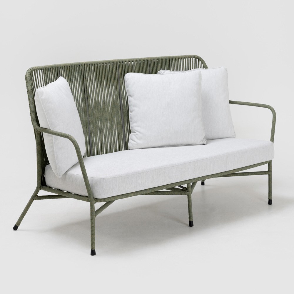 Ten salon ogrodowy to wysublimowana oaza komfortu i stylu, zaprojektowana tak, aby przekształcić każdą przestrzeń zewnętrzną w luksusowe przedłużenie domu. Dzięki dwuosobowej sofie i pasującym fotelom, każdy element ma ramę z plecionej liny, która harmonijnie wtapia się w naturalne środowisko, podkreślając piękno na zewnątrz.