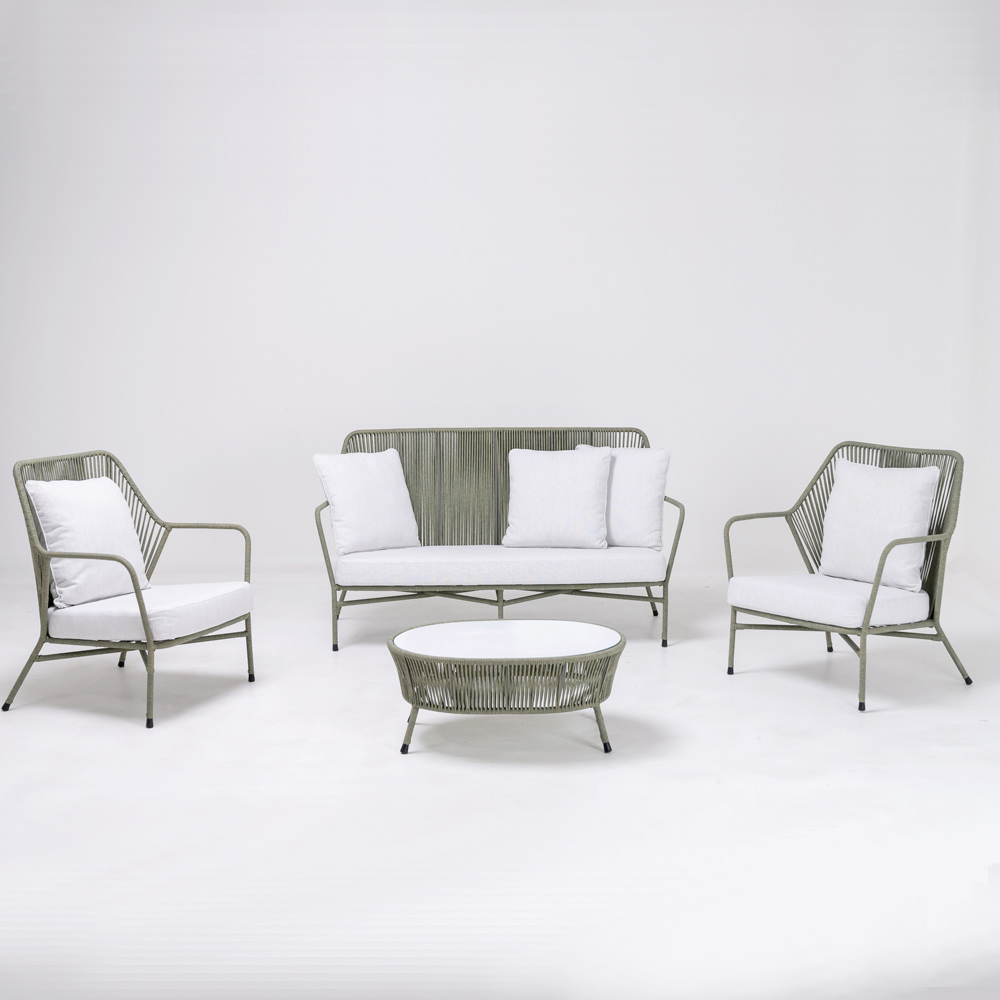 Zestaw wypoczynkowy do ogrodu z aluminium, splotem linowym ROPE+, szkłem i poduszkami