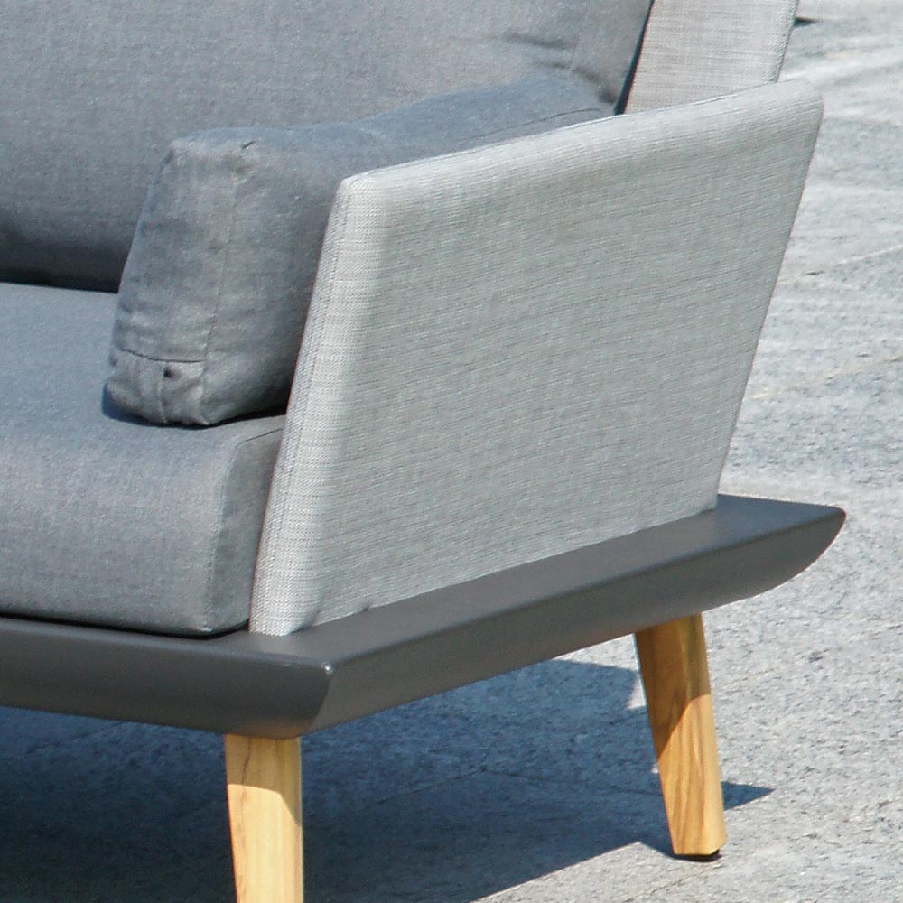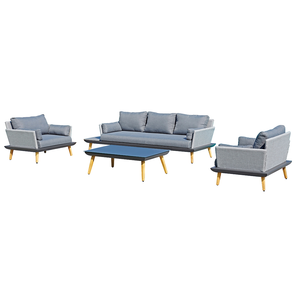 Zewnętrzny salon składający się z 2 foteli i 3-osobowej sofy, wyposażony w praktyczny stolik boczny z blatem z żywicy drzewnej pokrytym