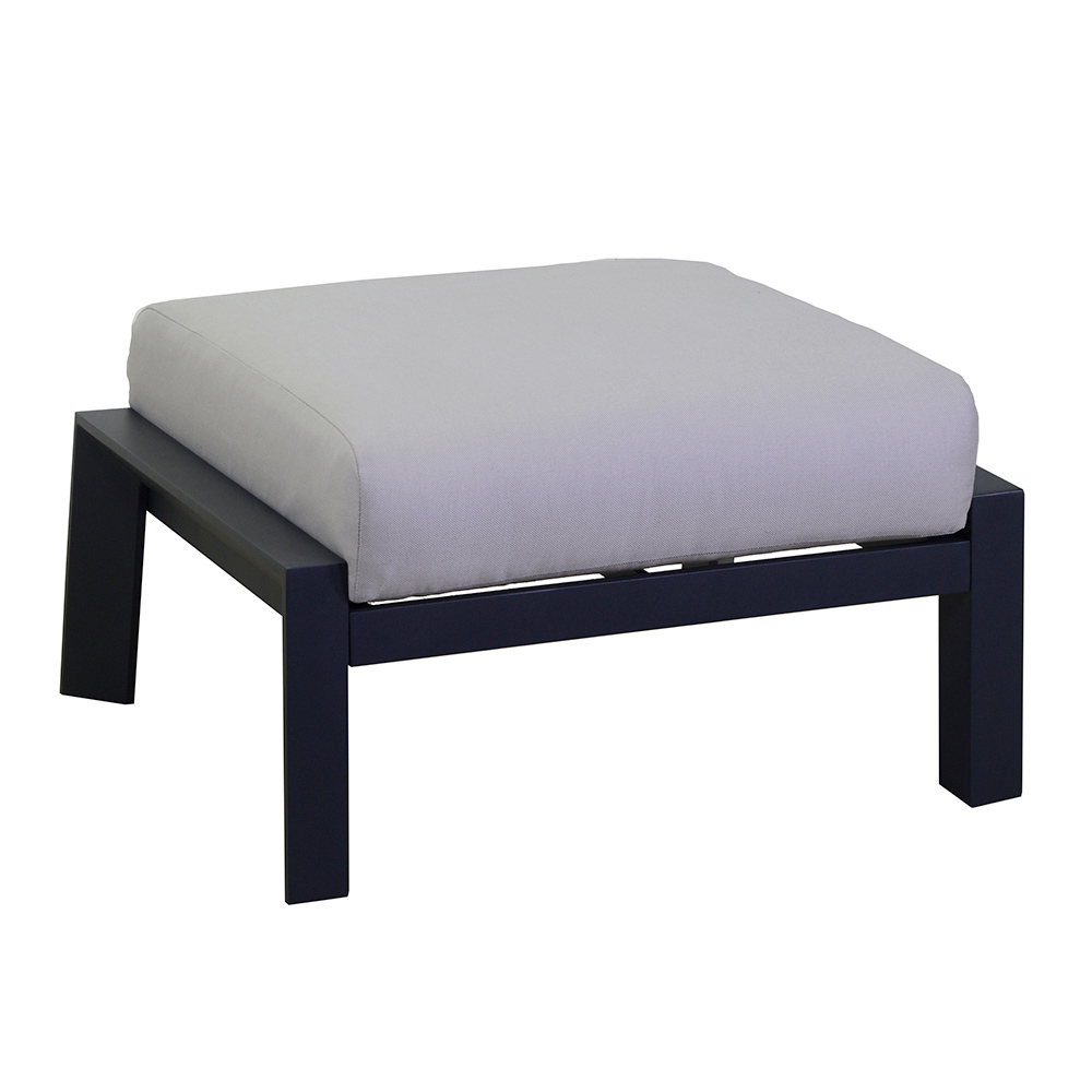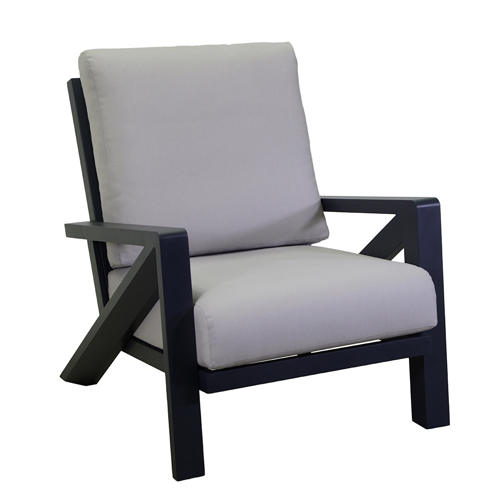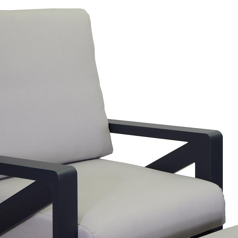 2 foteli z podnóżkiem: rama z nierdzewnego aluminium, malowana proszkowo na kolor antracytowy, wodoodporne poduszki z jasnoszarej olefiny, zdejmowane pokrowce.