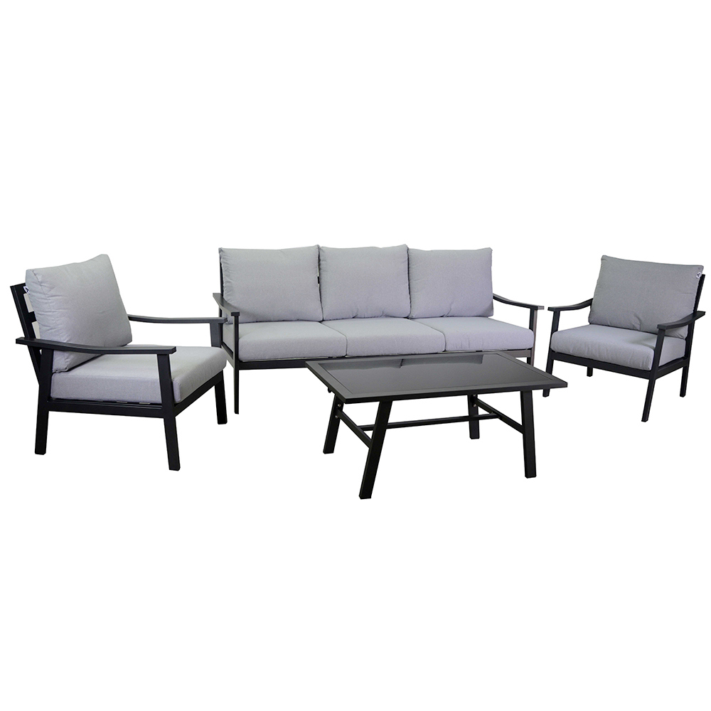 Zestaw uzupełnia stolik centralny ze szklanym blatem, idealny do przechowywania napojów i przekąsek, dzięki czemu ten zestaw jest centralnym elementem każdego spotkania towarzyskiego na świeżym powietrzu. Minimalistyczny i nowoczesny design salonu idealnie wkomponuje się w każdą przestrzeń zewnętrzną, dodając odrobinę nowoczesnego stylu.