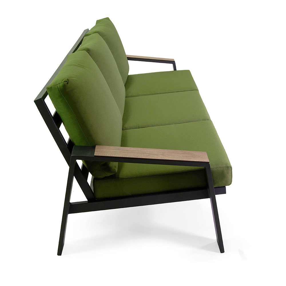 Ten oliwkowozielony aluminiowy zestaw wypoczynkowy, wzbogacony o luksusowo wyściełane poduszki, oferuje świeżą i naturalną atmosferę na zewnątrz. Zestaw składa się z trzyosobowej sofy, dwóch pojedynczych foteli i solidnego stolika kawowego z blatem HPL z efektem drewna, idealnego do stworzenia eleganckiego i przyjaznego kącika do rozmów w ogrodzie lub na patio. Nowoczesny design z czystymi liniami i jasnymi kolorami doskonale integruje się z każdym kontekstem zewnętrznym, dodając odrobinę stylu i komfortu.