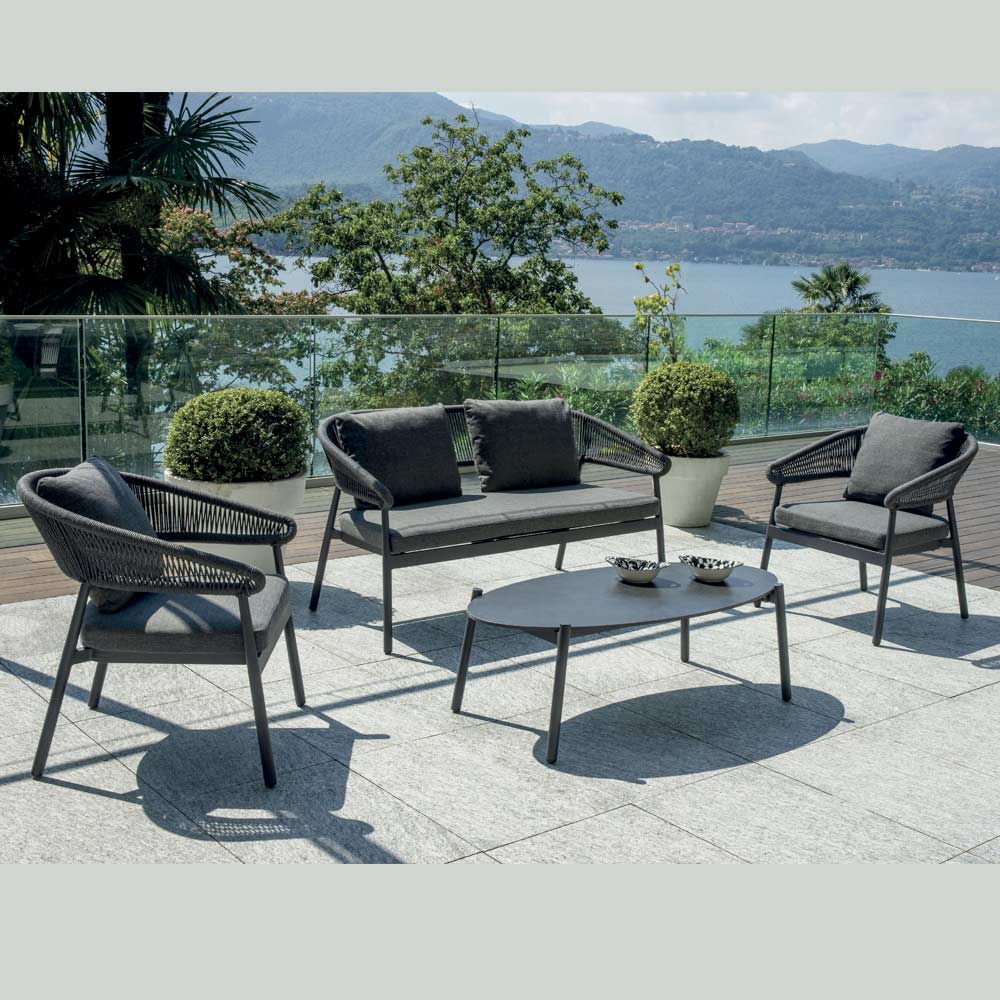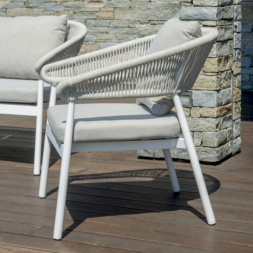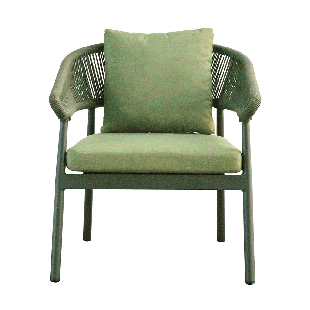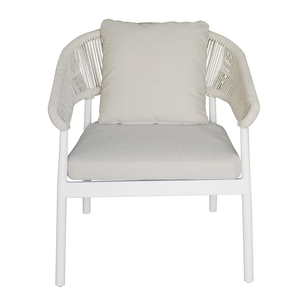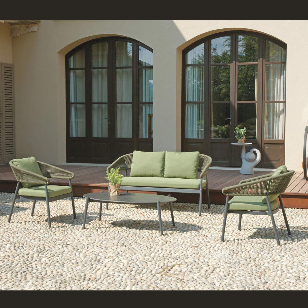 Ten salon ogrodowy jest idealnym rozwiązaniem dla tych, którzy szukają idealnej równowagi między elegancją i komfortem. Składający się z foteli i sofy z tapicerowanymi poduszkami oraz solidnego stolika kawowego, zestaw ten jest idealnym dodatkiem, aby cieszyć się relaksującymi chwilami na świeżym powietrzu. Nowoczesny design i czyste linie idealnie pasują do każdego otoczenia zewnętrznego, od przestronnych patio po przytulne ogrody.
