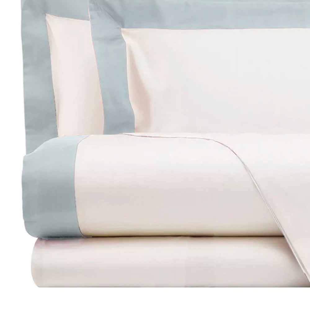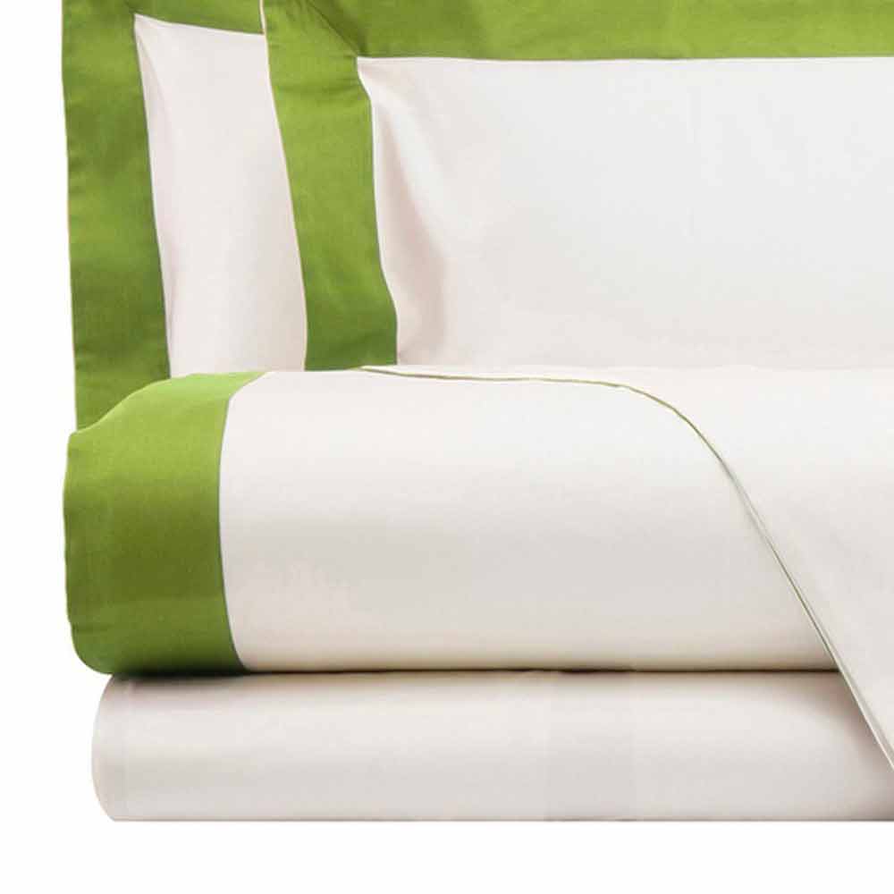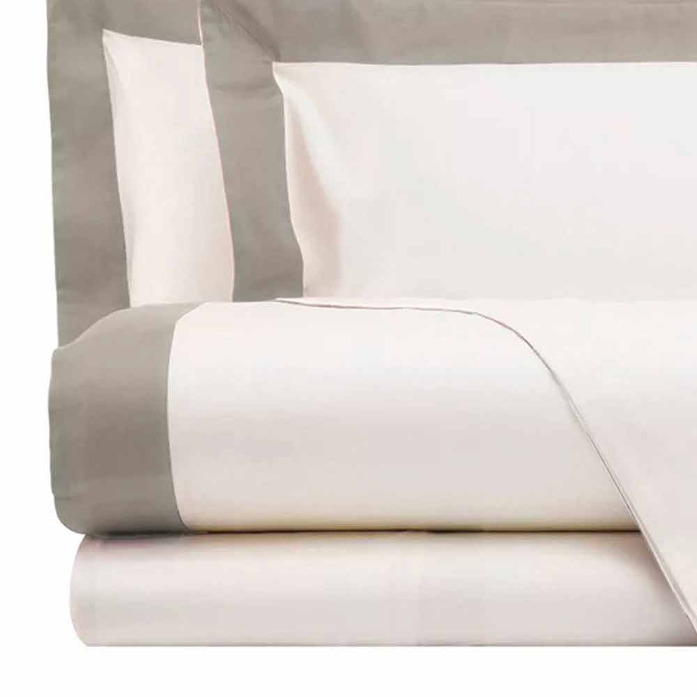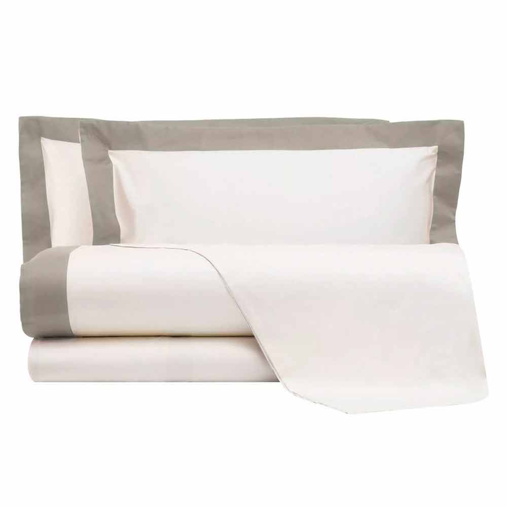W komplecie prześcieradła w kolorze kości słoniowej z kontrastującą obwódką w różnych kolorach na podwójne łóżko z satyny 200 TC wyprodukowanej we Włoszech.