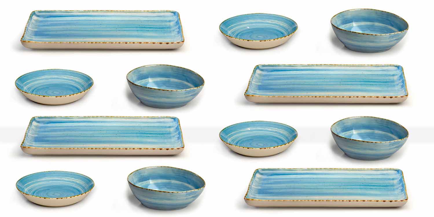 Serwis 12 nowoczesnych prostokątnych i okrągłych kamionkowych płyt o eleganckim i oryginalnym designie.