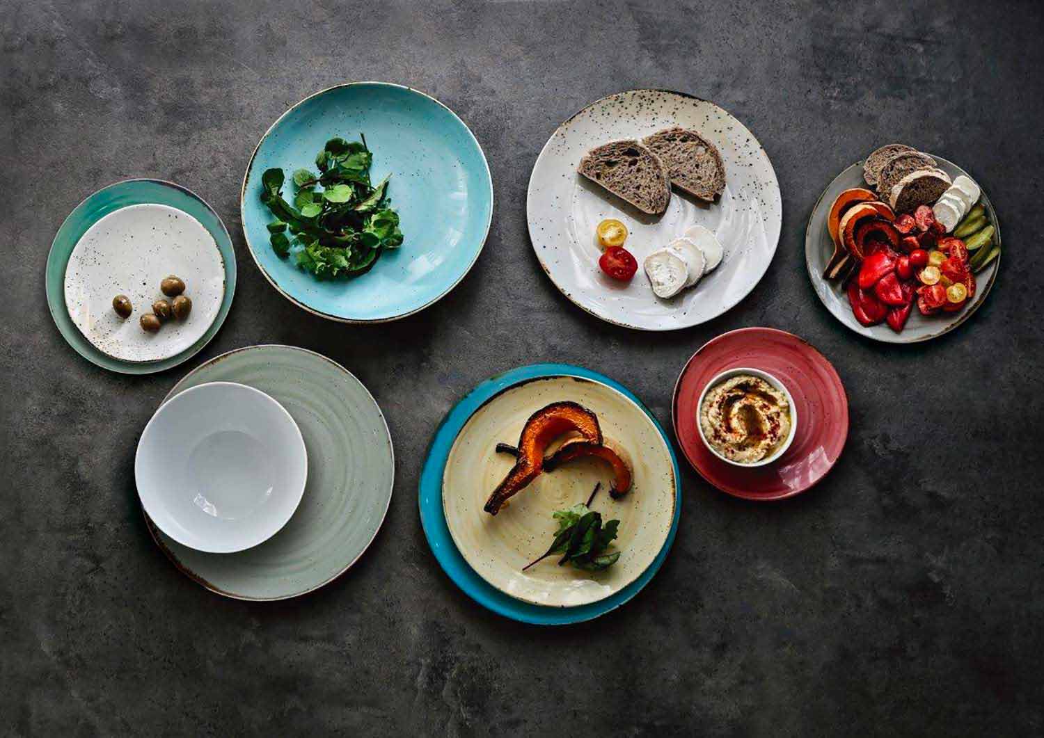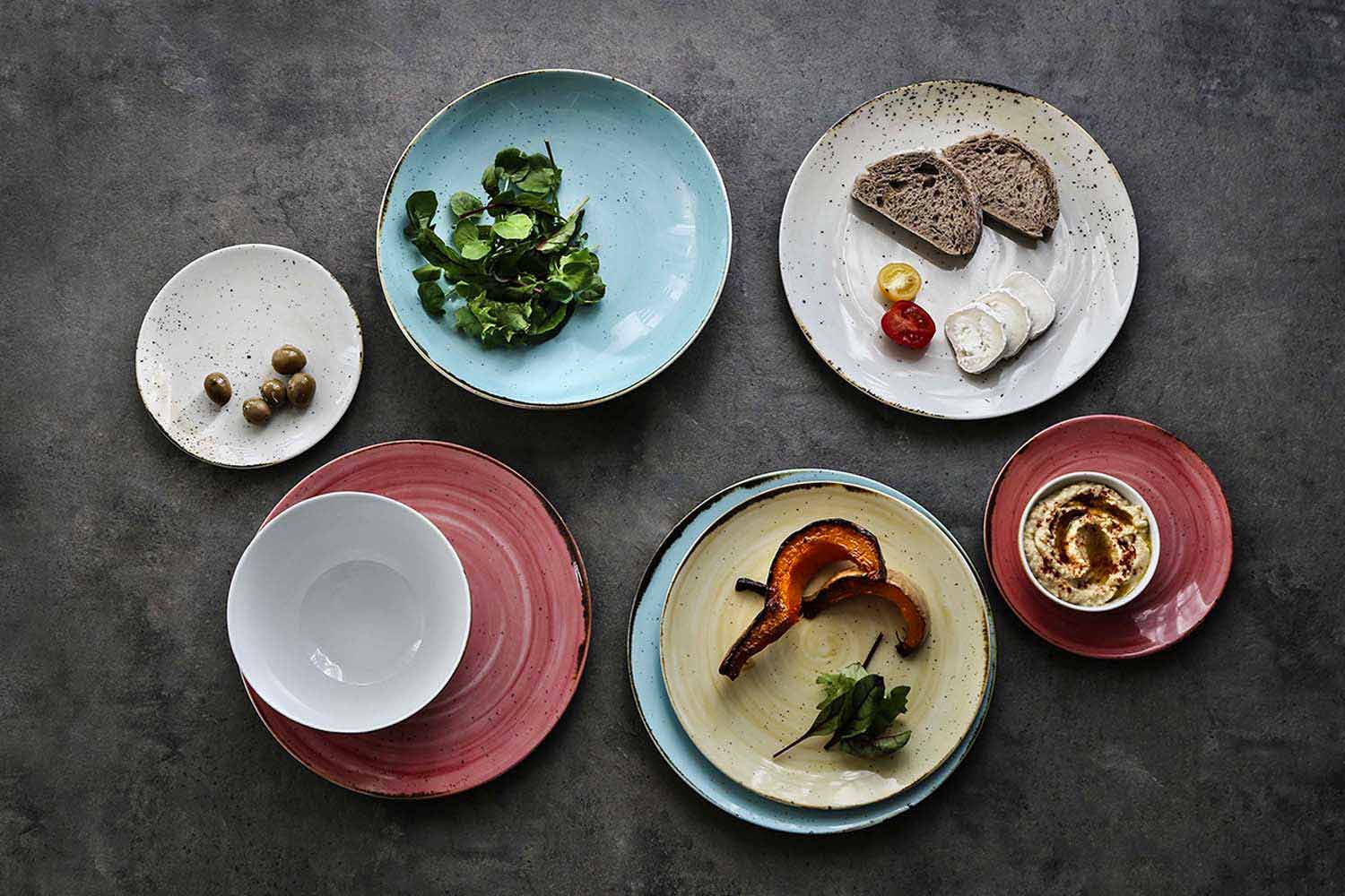 zestawu talerzy obiadowych jest przedstawiany jako prosty, elegancki i wyrafinowany, wykonany z kalcomanii w różnych kolorach, dla rustykalnego i wszechstronnego stylu.