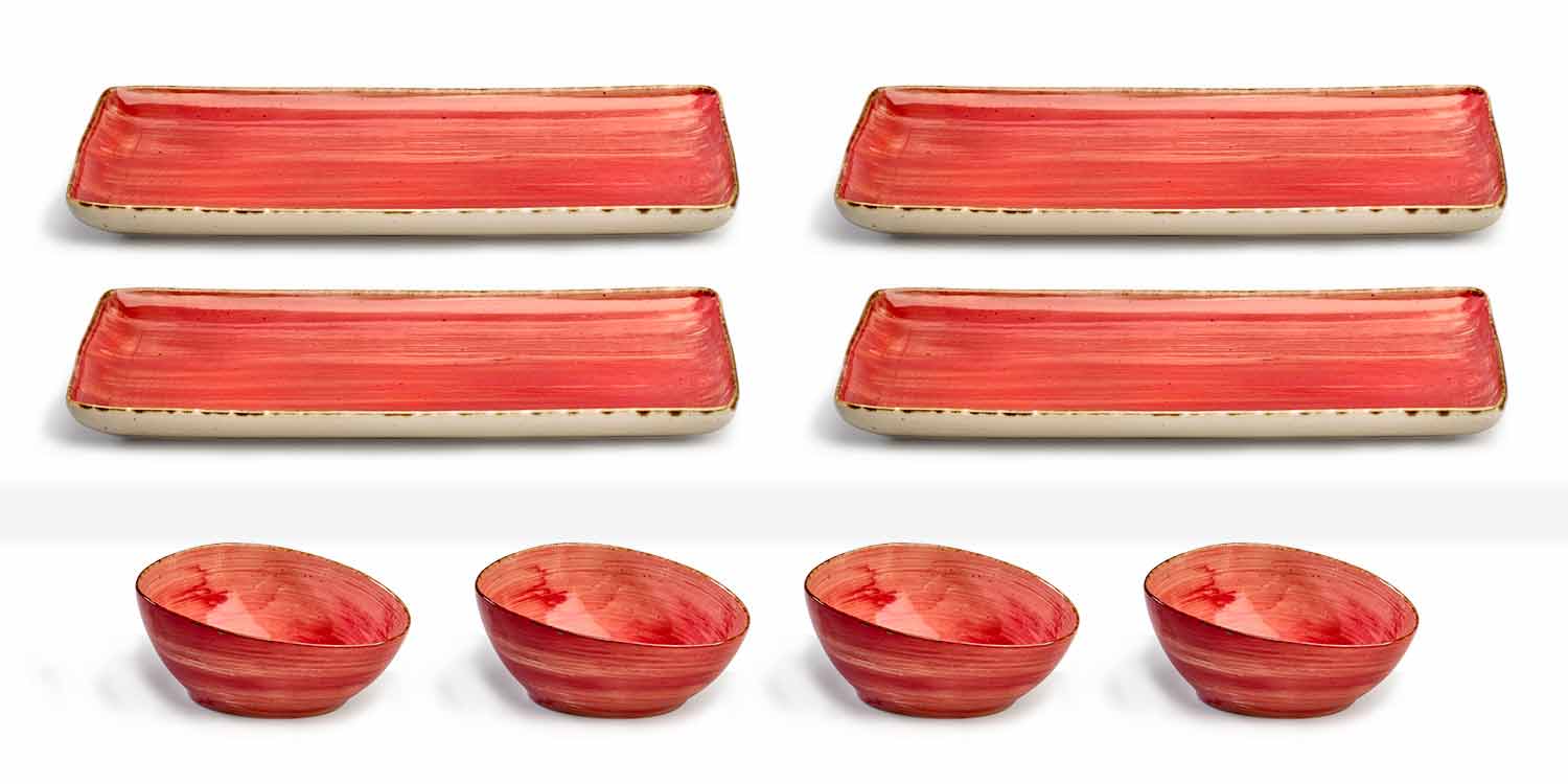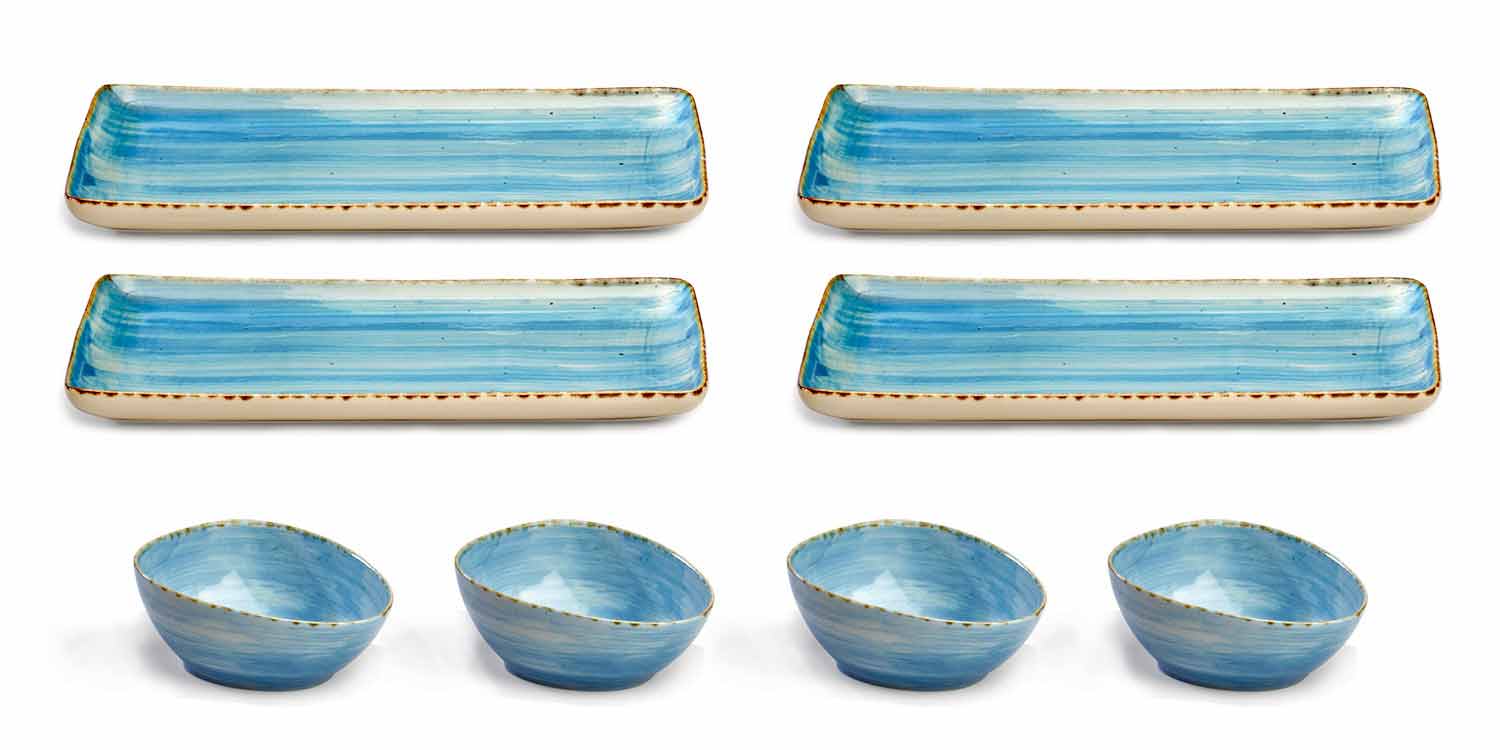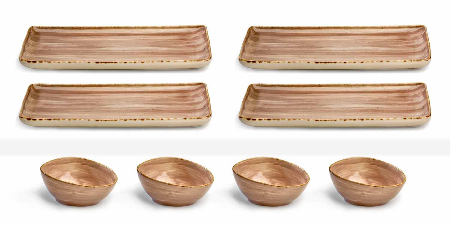 Serwująca naczynia o nowoczesnym i uniwersalnym designie, 4 okrągłe miski i 4 prostokątne talerze z kolorowej kamionki.