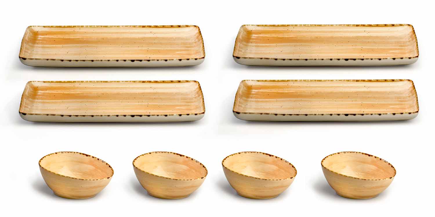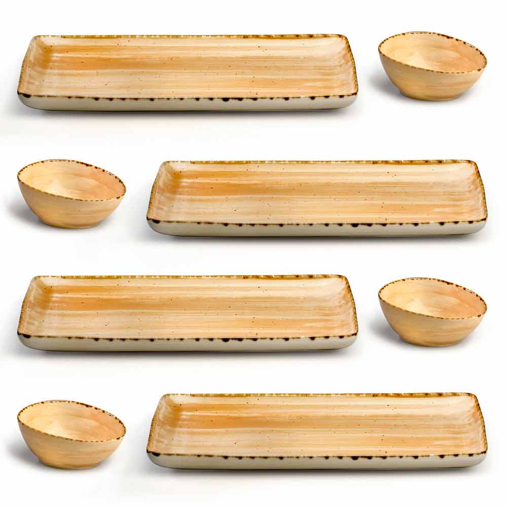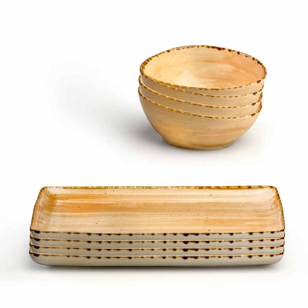 Serwująca naczynia o nowoczesnym i uniwersalnym designie, 4 okrągłe miski i 4 prostokątne talerze z kolorowej kamionki.