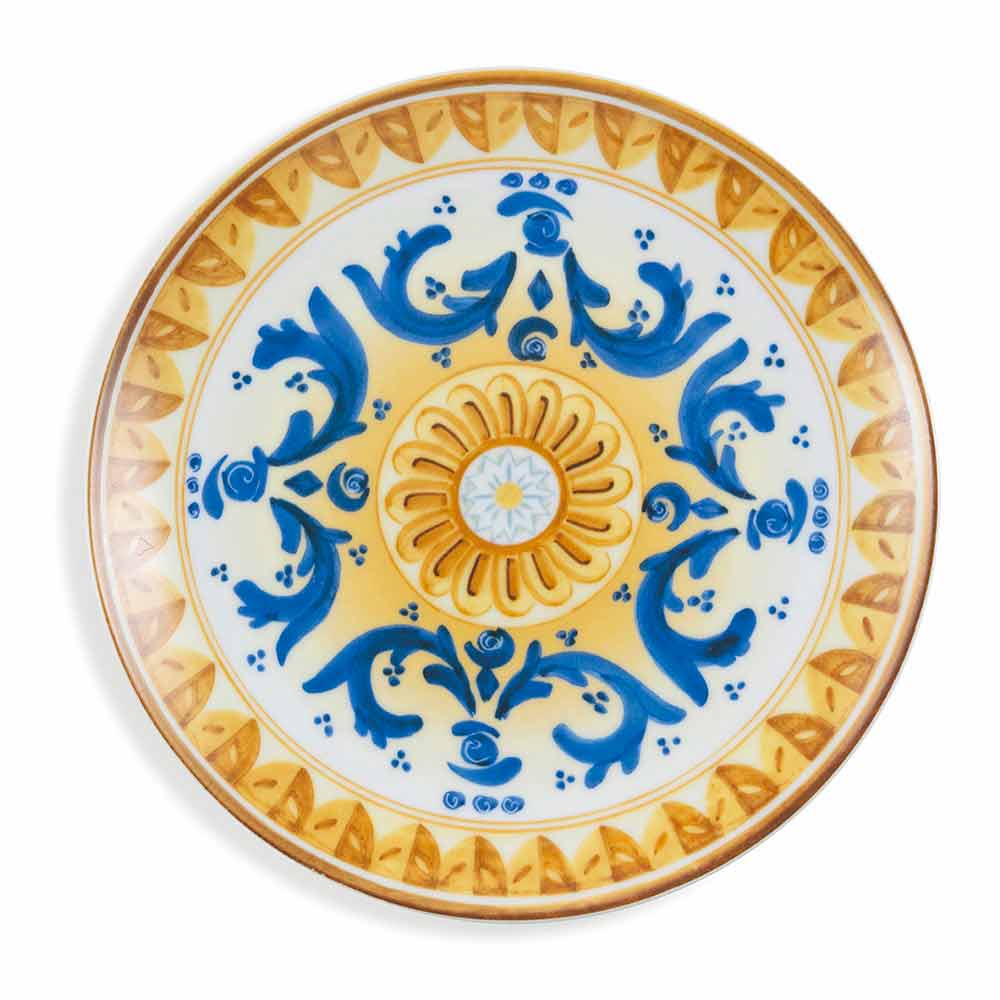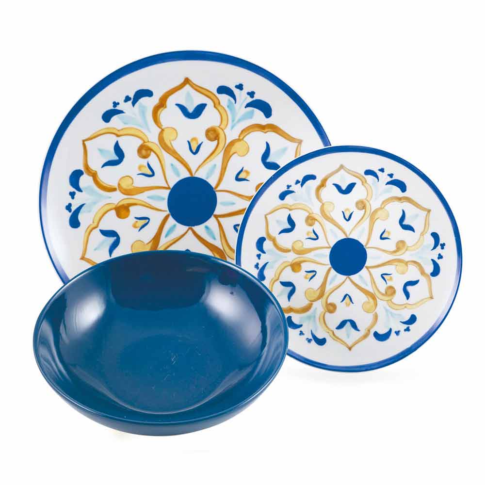 Serwis stołowy z porcelany i kamionki w kolorze niebieskim i żółtym, nowoczesny design z 18 sztuk.