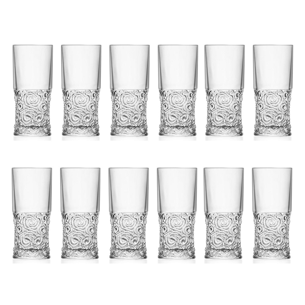 Szklanki highball z ekologicznego kryształu z okrągłym zdobieniem 12 sztuk wyprodukowane we Włoszech.