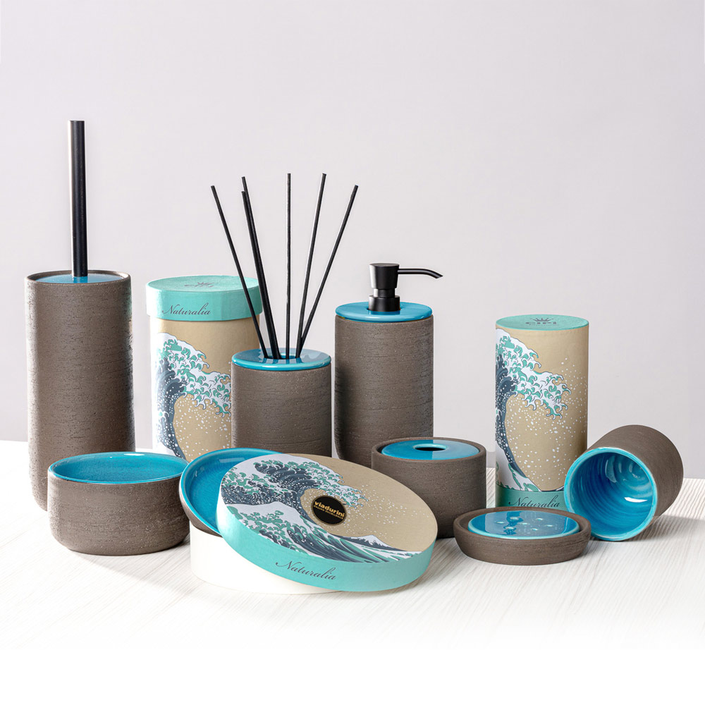 Akcesoria łazienkowe z gliny ogniotrwałej z emaliowanymi detalami Wyprodukowano we Włoszech.