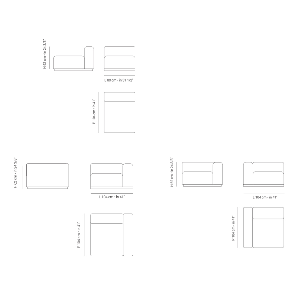 Wymiary elementu:- prawy element narożny: dł. 104 x gł. 104 x wys. 62 cm