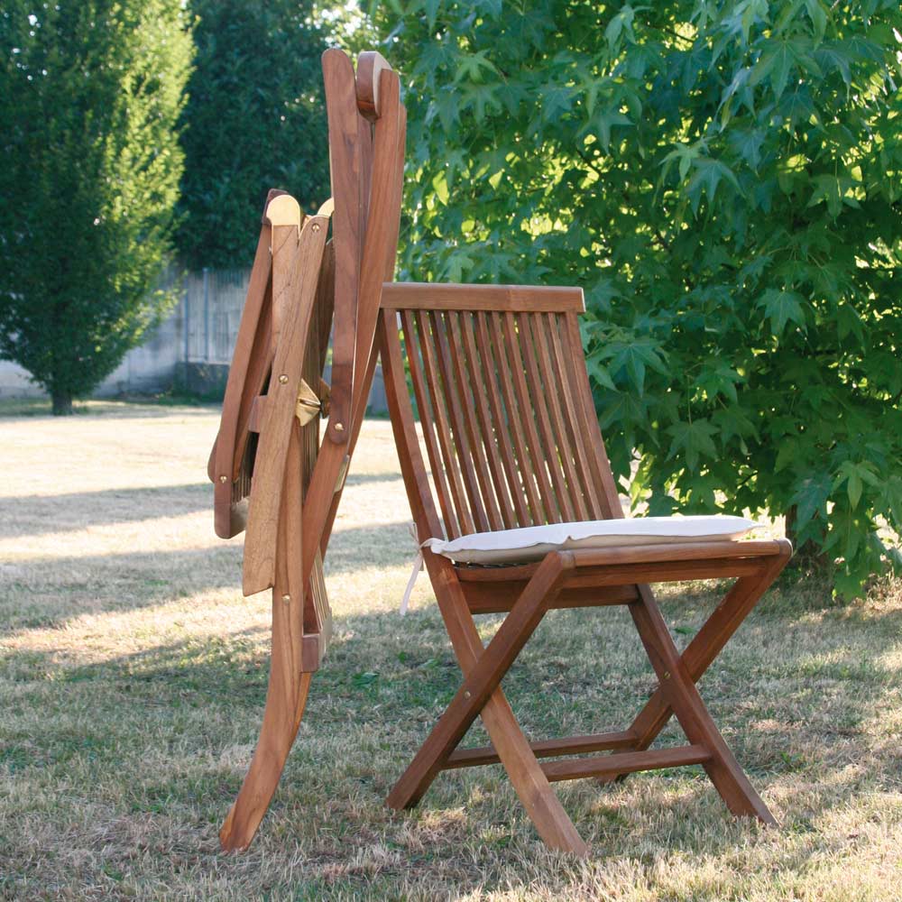 . Składane krzesła do użytku na zewnątrz, z wodoodporną kremową poduszką.