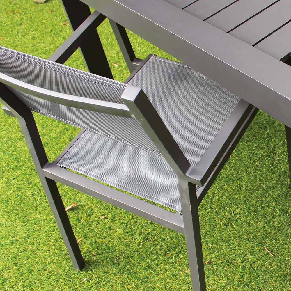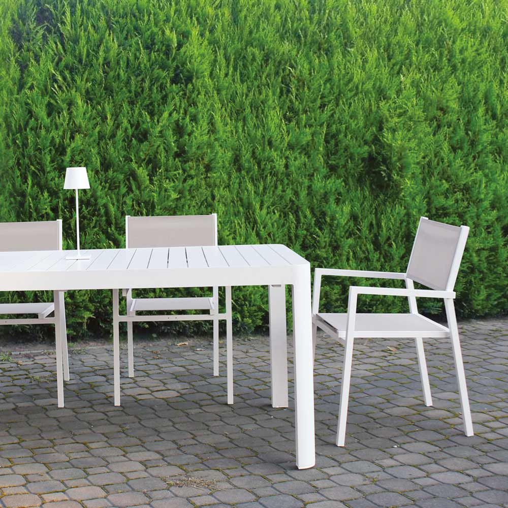 To krzesło ogrodowe jest doskonałym przykładem czystego designu i nowoczesnej funkcjonalności . Wykonane z malowanej aluminiowej ramy, łączy odporność na warunki atmosferyczne z lekkością, dzięki czemu jest łatwe do przenoszenia i obsługi w każdym kontekście na zewnątrz.
