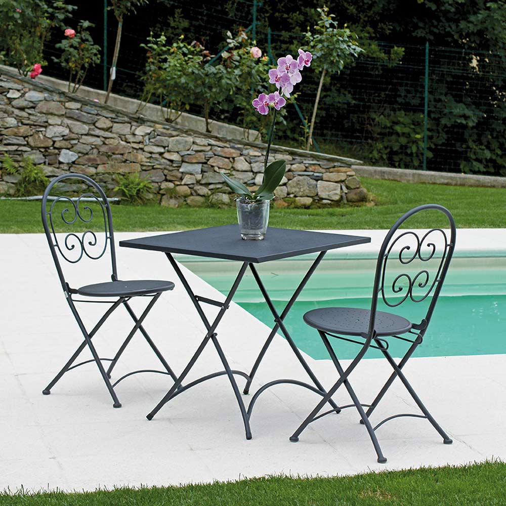 Składany stół ogrodowy z blatem i podstawą z żelaza z wykończeniem w kolorze antracytowej szarości . Mebel charakteryzujący się prostą i funkcjonalną estetyką o kwadratowym kształcie. Ten aspekt sprawia, że jest to idealne rozwiązanie dla tych, którzy uwielbiają spędzać wolny czas na świeżym powietrzu i nie chcą rezygnować z odrobiny ekskluzywnego i oryginalnego stylu .
