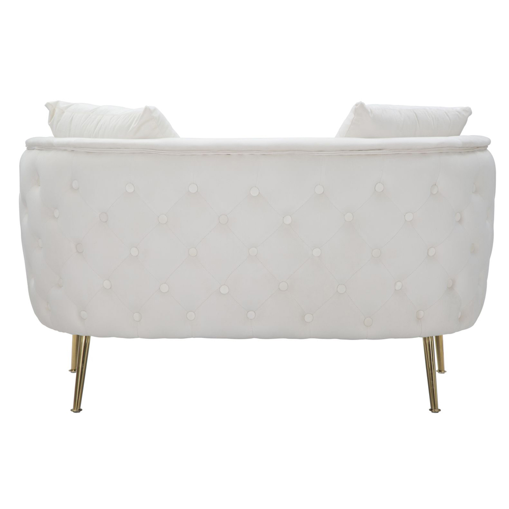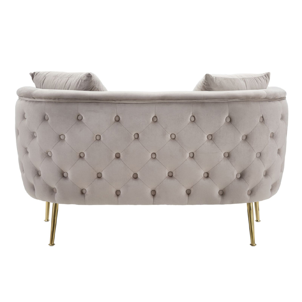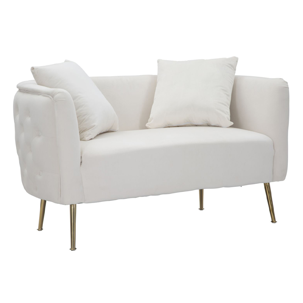 Sofa 2 osobowa tapicerowana i pokryta aksamitem ze złotymi żelaznymi nóżkami.