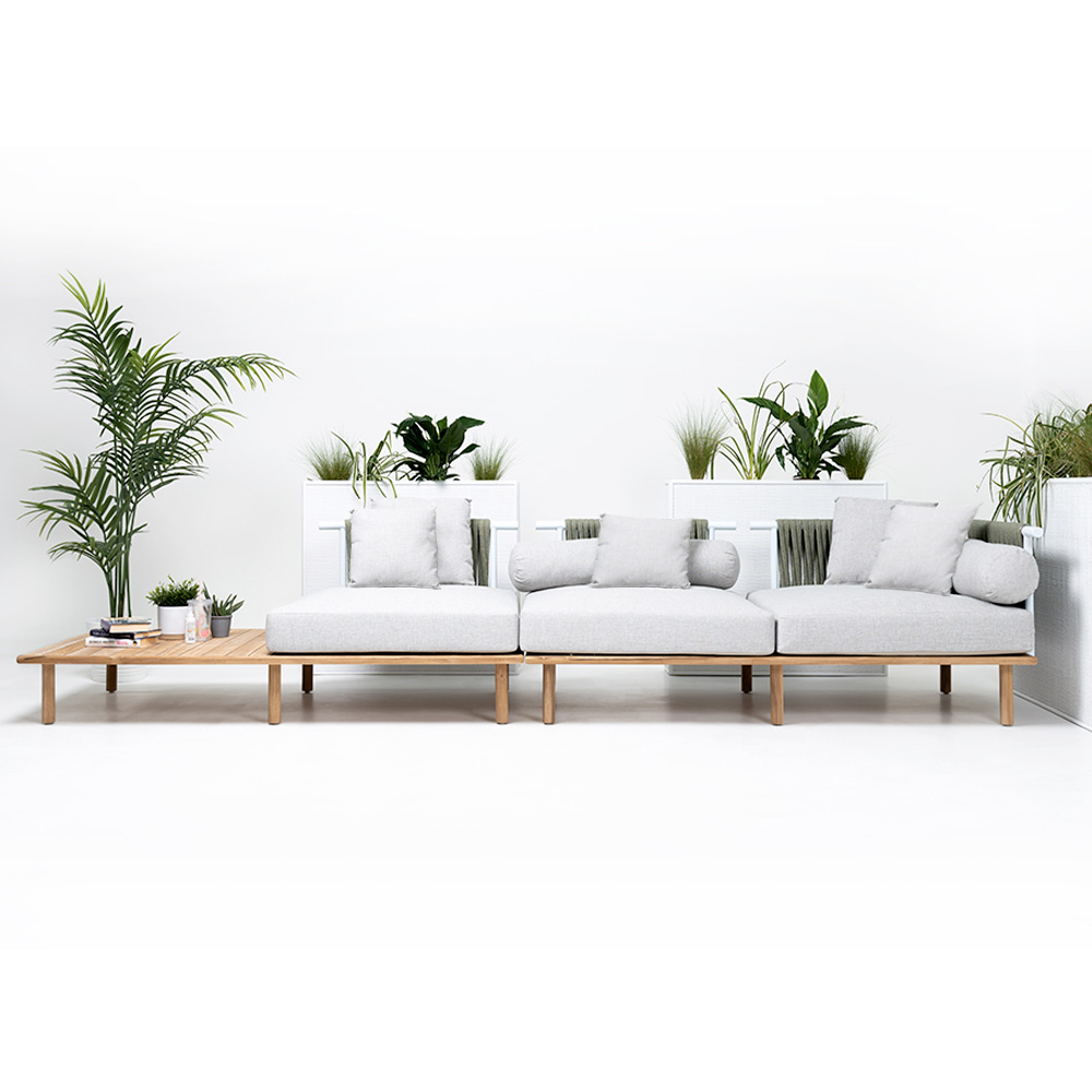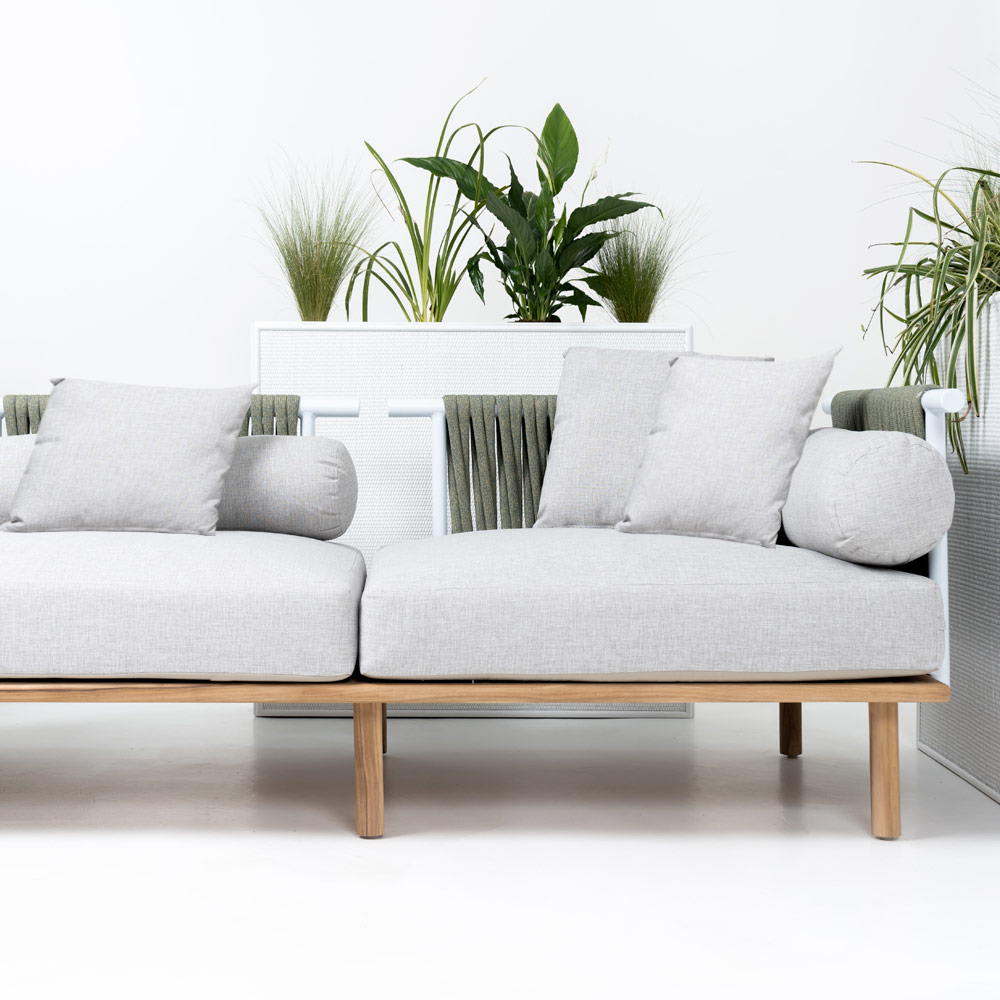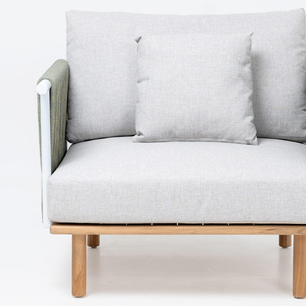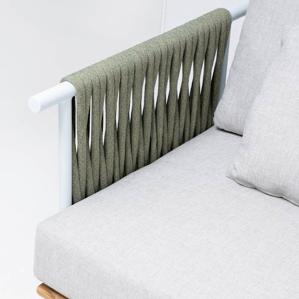 Modułowa sofa ogrodowa z drewna tekowego, aluminiowymi oparciami i splotem z tkaniny Olefin/PP ROPE oraz poduszkami