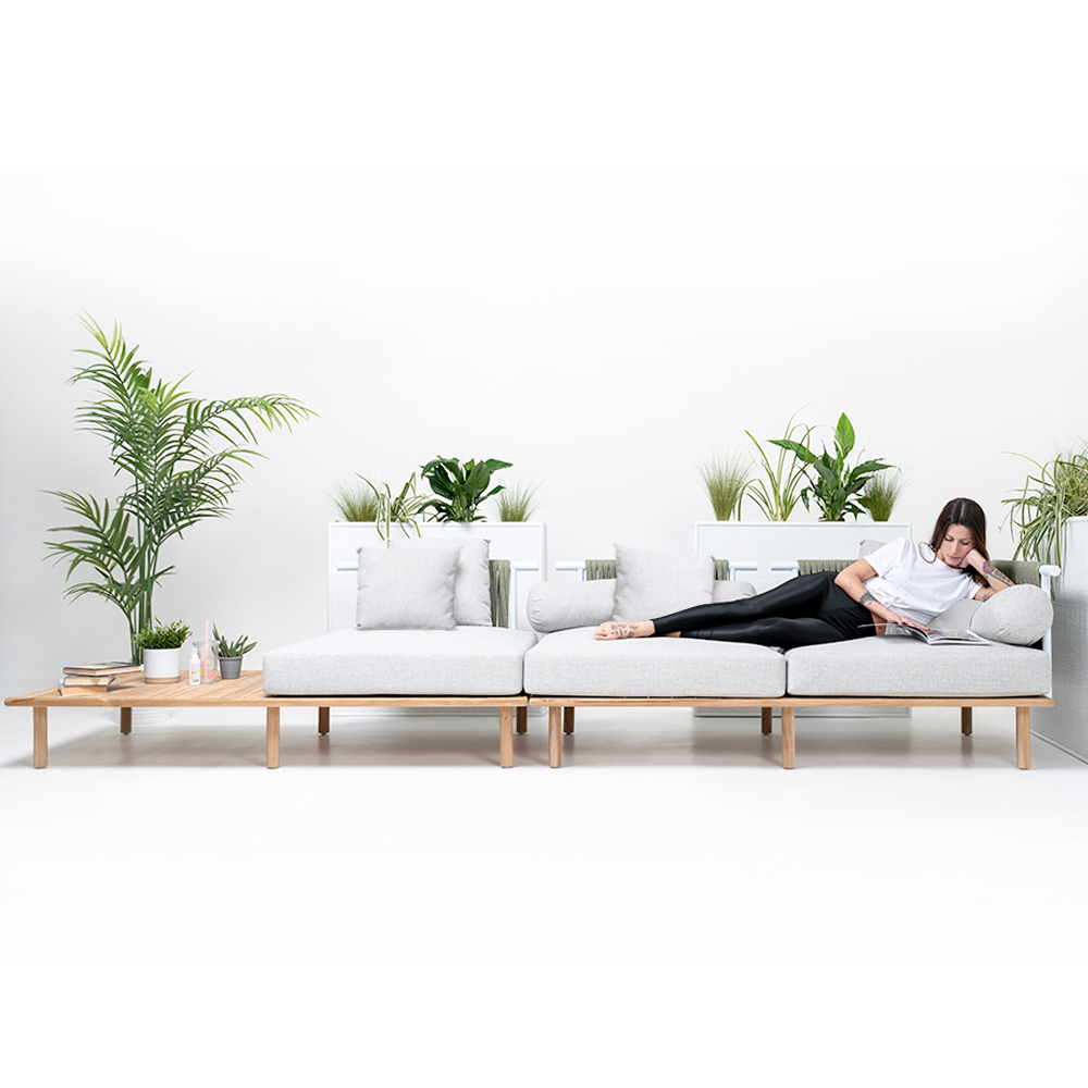 NB: W zestawie znajdują się 4 poduszki na siedziska, 2 poduszki na oparcia 80x50 cm, 2 poduszki 40x40 cm i 2 rolki 70xdiam.15 cm. Wszystkie poduszki są w jasnoszarym wykończeniu, ale można je dostosować.