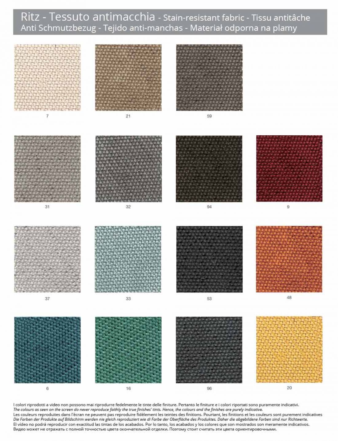 - tkanina antyplamowa Ritz ; Ritz to przyjemna w dotyku tkanina, wybrana jako pokrycie tych siedzeń dzięki swojej charakterystycznej odporności na zużycie. Jest to tkanina przeciw plamom w składzie 86% Poliester, 14% Poliamid. Waga / grubość 490 gr / mtl.