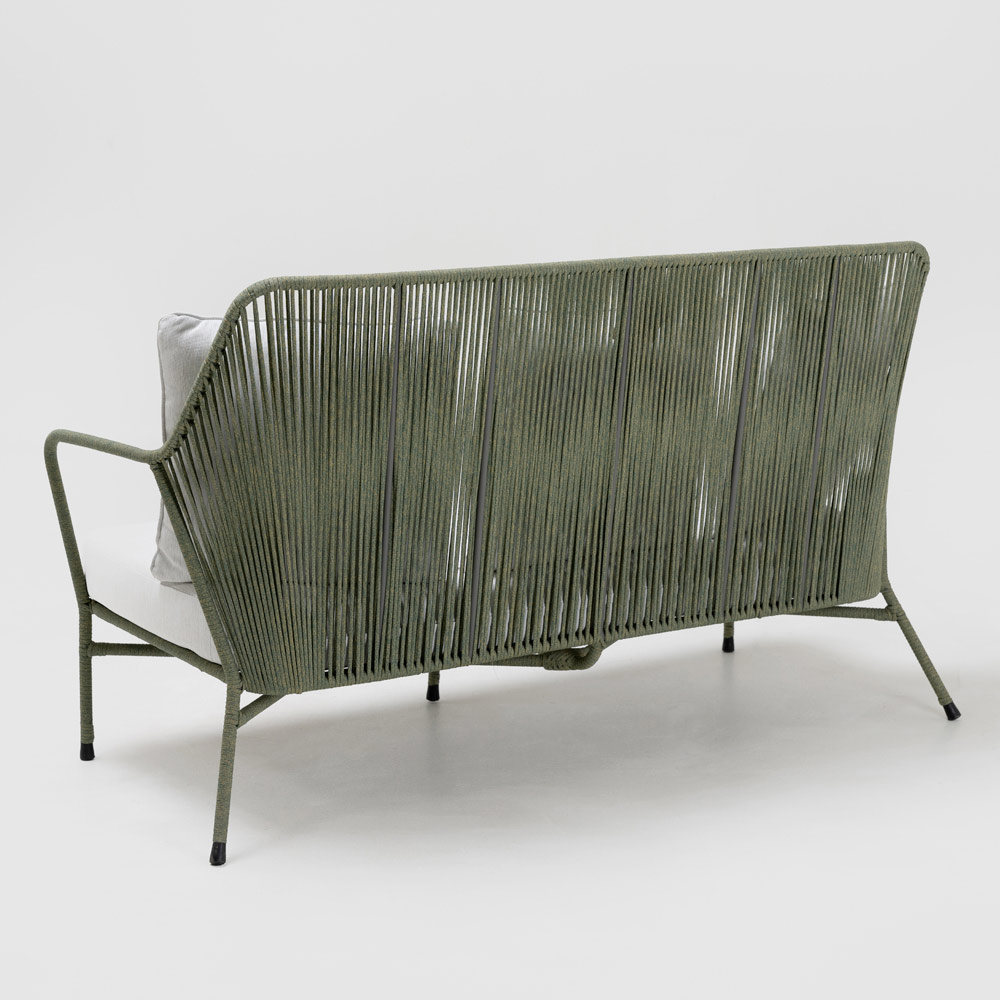 Ta sofa ogrodowa jest oazą relaksu, idealną do cieszenia się spokojem na świeżym powietrzu. Jej design jest nowoczesny, a lekka struktura z plecionej liny tworzy grę przezroczystości i cieni, dodając głębi i wizualnego zainteresowania do ogrodu lub tarasu.