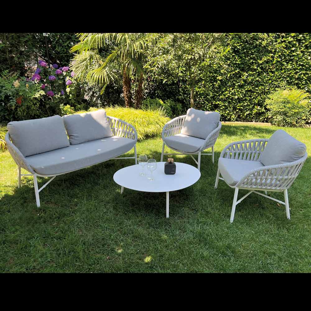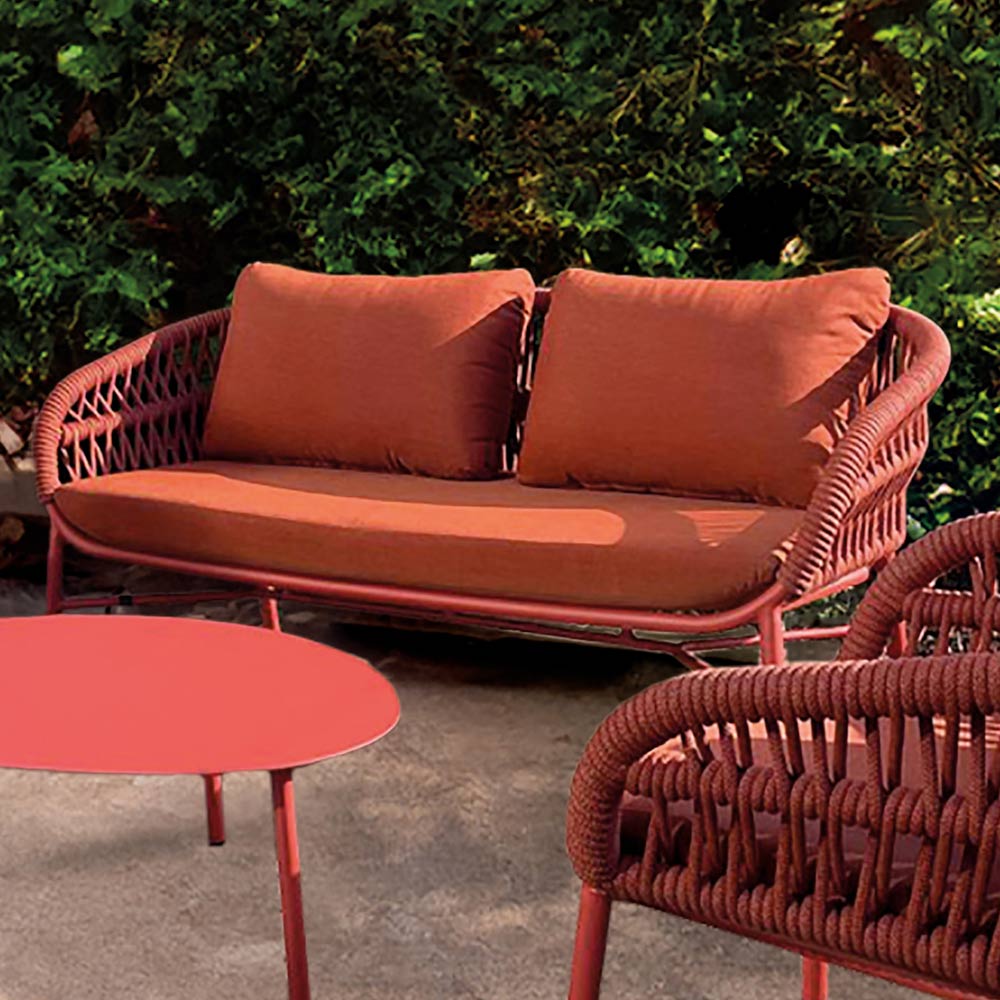 Ta ogrodowa sofa jest doskonałym przykładem przyjaznego designu i rzemieślniczego wyrafinowania , idealna do stworzenia kącika wypoczynkowego poświęconego relaksowi i stylowi . Malowana aluminiowa konstrukcja, lekka, ale wytrzymała, elegancko podtrzymuje wyrafinowany splot z liny poliestrowej , która nadaje ruch i osobowość siedzisku.