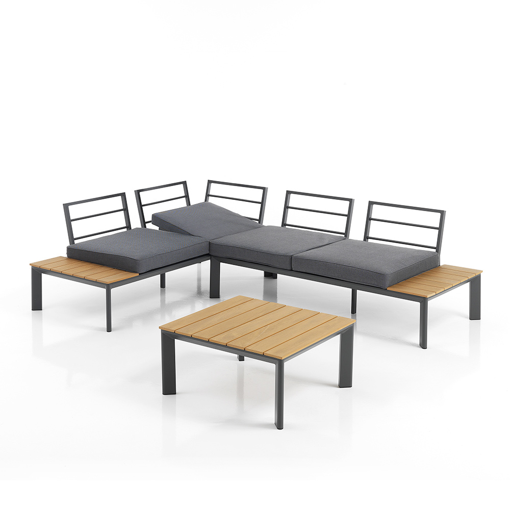 Regulowane oparcie salonu zachęca do znalezienia idealnego kącika komfortu do czytania, opalania lub spotkań towarzyskich. Centralny stół idealnie nadaje się do przechowywania orzeźwiających napojów, przekąsek lub ulubionej książki, dzięki czemu będzie centralnym punktem każdego miłego spotkania na świeżym powietrzu .