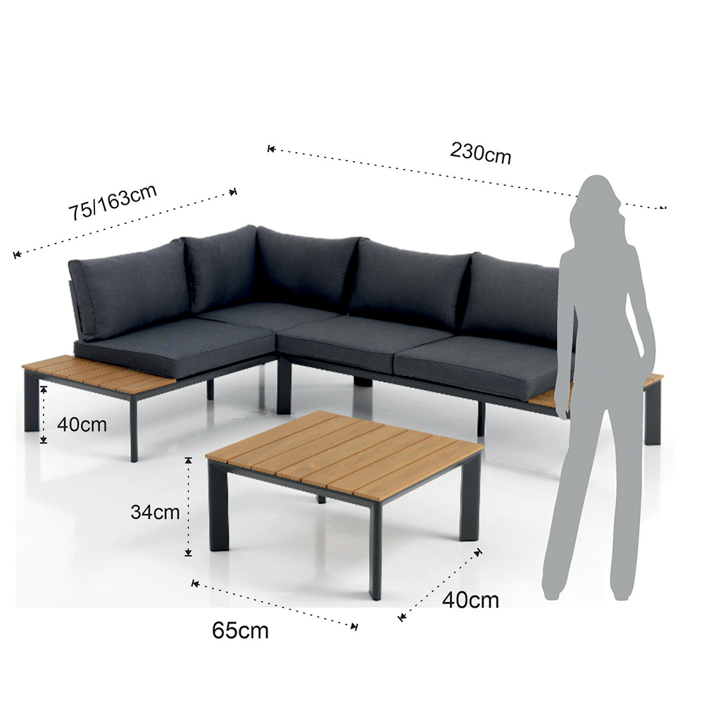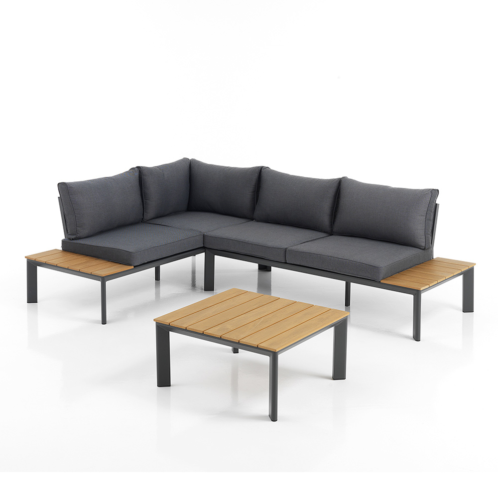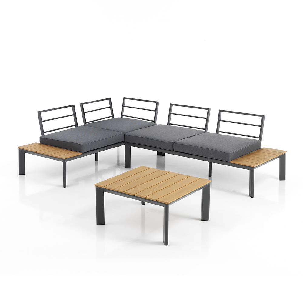 Ten salon ogrodowy ze stolikiem kawowym ucieleśnia niedrogi luksus i wszechstronne wzornictwo . Unikalne połączenie aluminium i drewna poliestrowego zapewnia elegancką, współczesną estetykę, która idealnie pasuje zarówno do nowoczesnych, jak i tradycyjnych przestrzeni. Szare poliestrowe poduszki nie tylko zapewniają wysublimowany komfort, ale także dodają zestawowi szczypty wyrafinowanej prostoty .