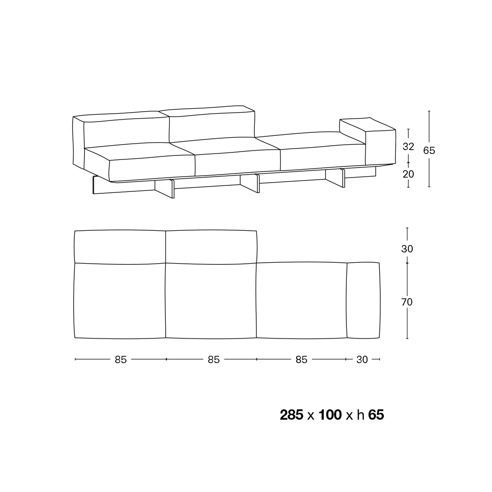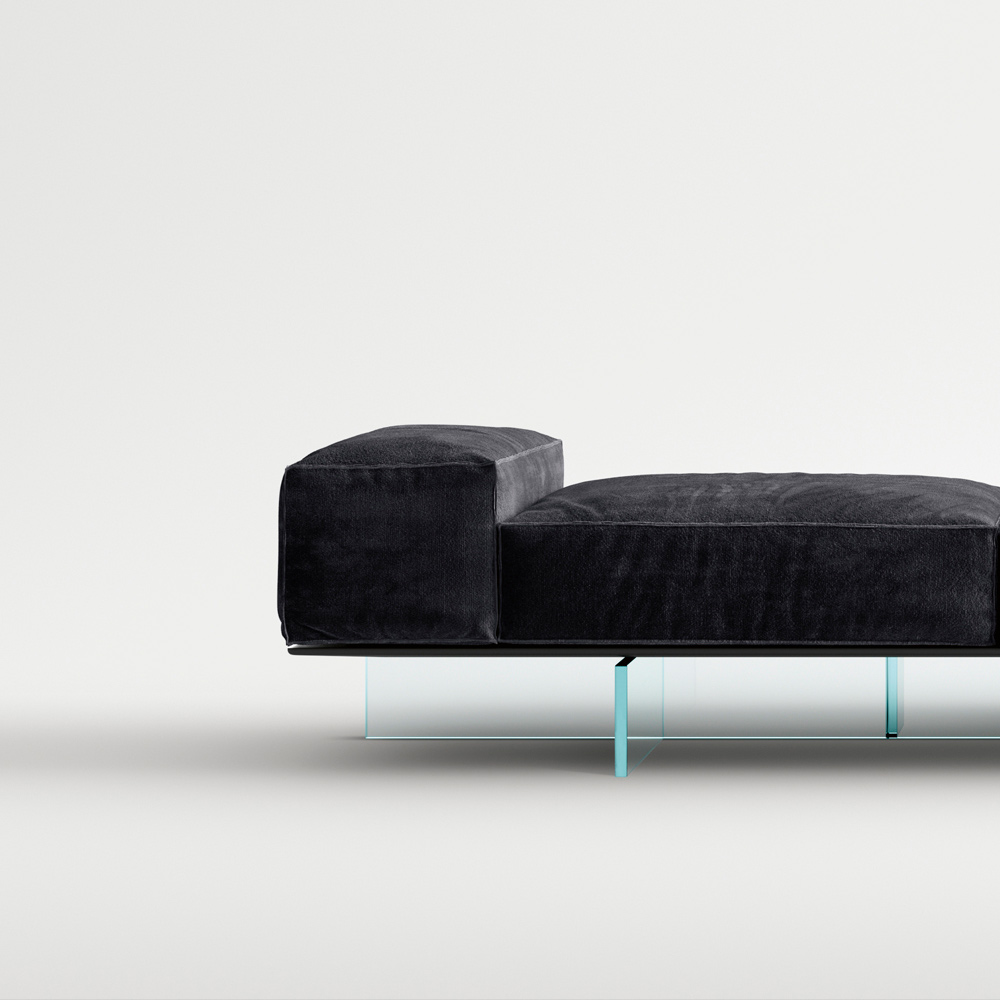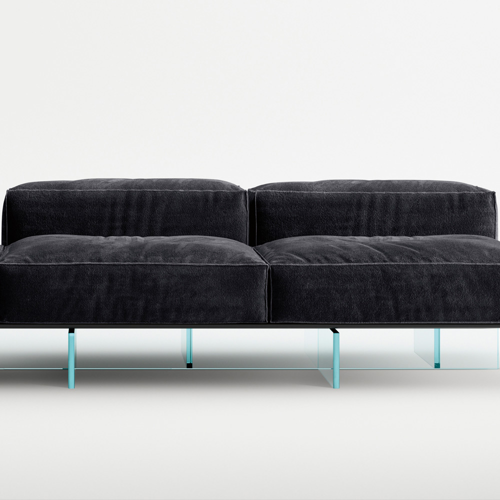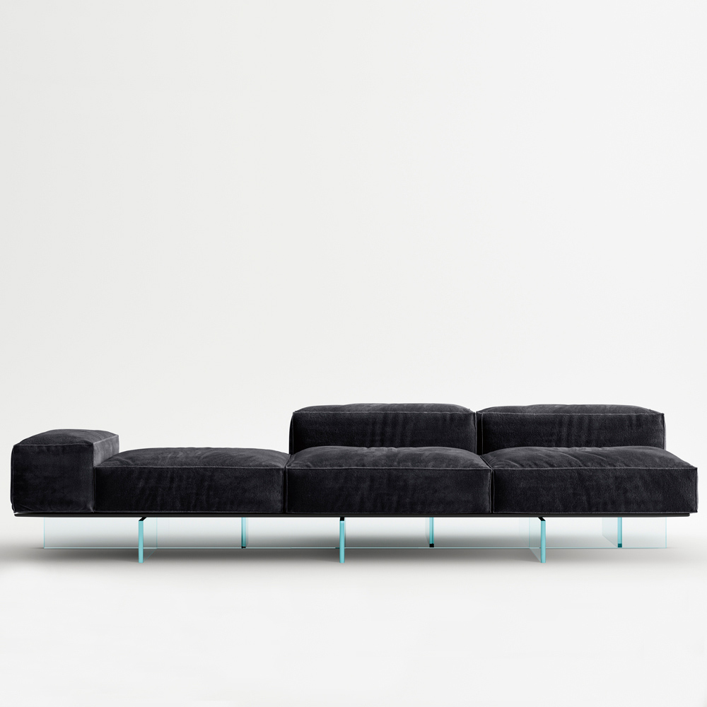 Złożony z miękkich i obficie wyściełanych brył, system siedzisk wprowadza nowy sposób projektowania przestrzeni życiowej, z elementami, które pozwalają na oryginalne, bardziej dynamiczne i nieformalne kompozycje. Sofa zachowuje swoją wizualną lekkość dzięki podstawie, którą tworzą nóżki ze szkła laminowanego, podtrzymujące drewnianą platformę, na której spoczywają elementy tapicerowane. Wyrafinowane tkaniny wysokiej jakości i dopracowane detale opakowania to cechy wyróżniające projekt o nieszablonowym charakterze.