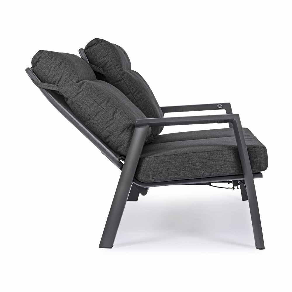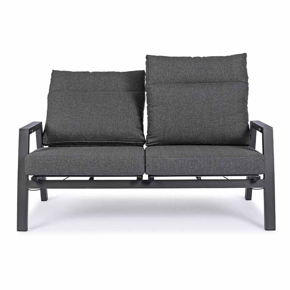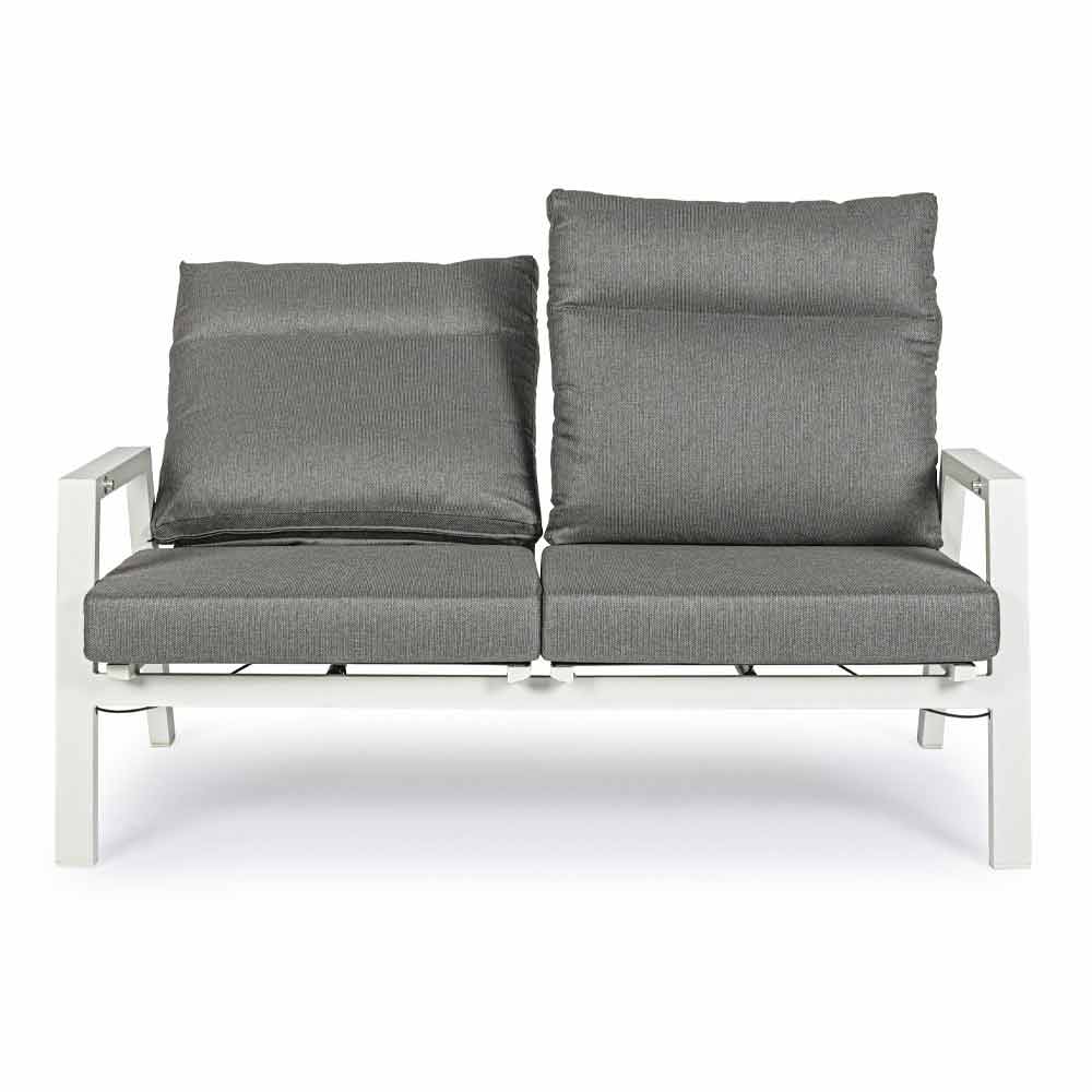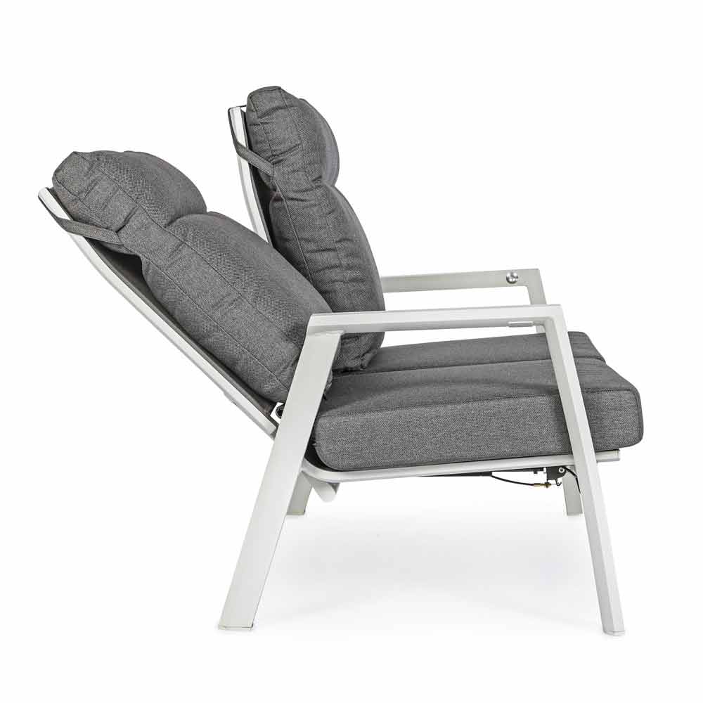 Dwuosobowa sofa zewnętrzna z aluminium i tkaniny z odchylanym oparciem.