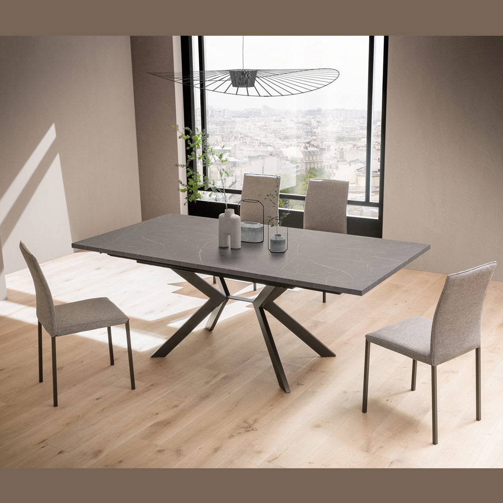 Podstawa z malowanego metalu i z geometrycznym wzorem krzyżowym oferuje stabilność i rzeźbiarski akcent , który nie pozostaje niezauważony. Idealne rozwiązanie wyposażenia jadalni, otwartych przestrzeni lub środowisk kontraktowych o wyrafinowanym stylu.