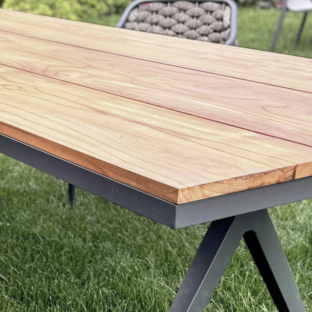 Prawdziwym bohaterem jest blat z litego drewna tekowego , wybór wartości rzemieślniczej , który nadaje stołowi ponadczasową elegancję. Drewno tekowe, znane ze swoich niezwykłych właściwości odporności i trwałości , nadaje stołowi ciepły i przyjazny wygląd, idealny do wyrafinowanych środowisk zewnętrznych.