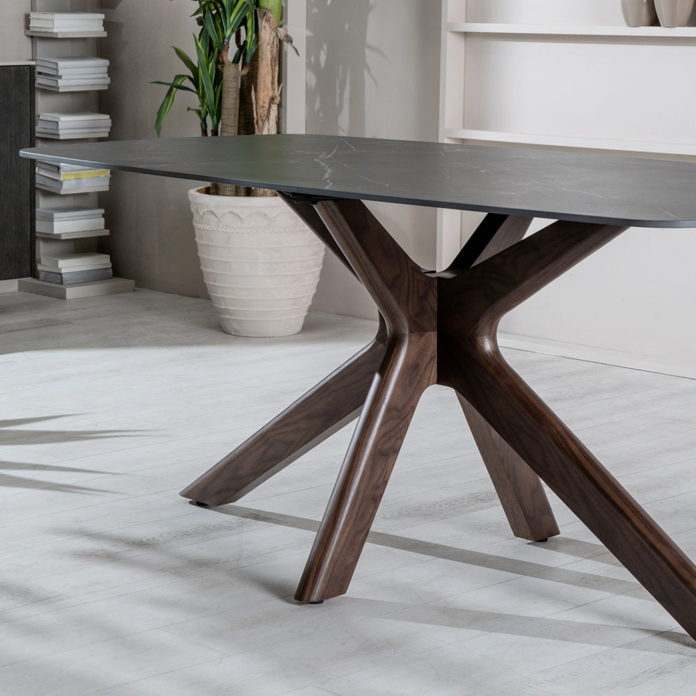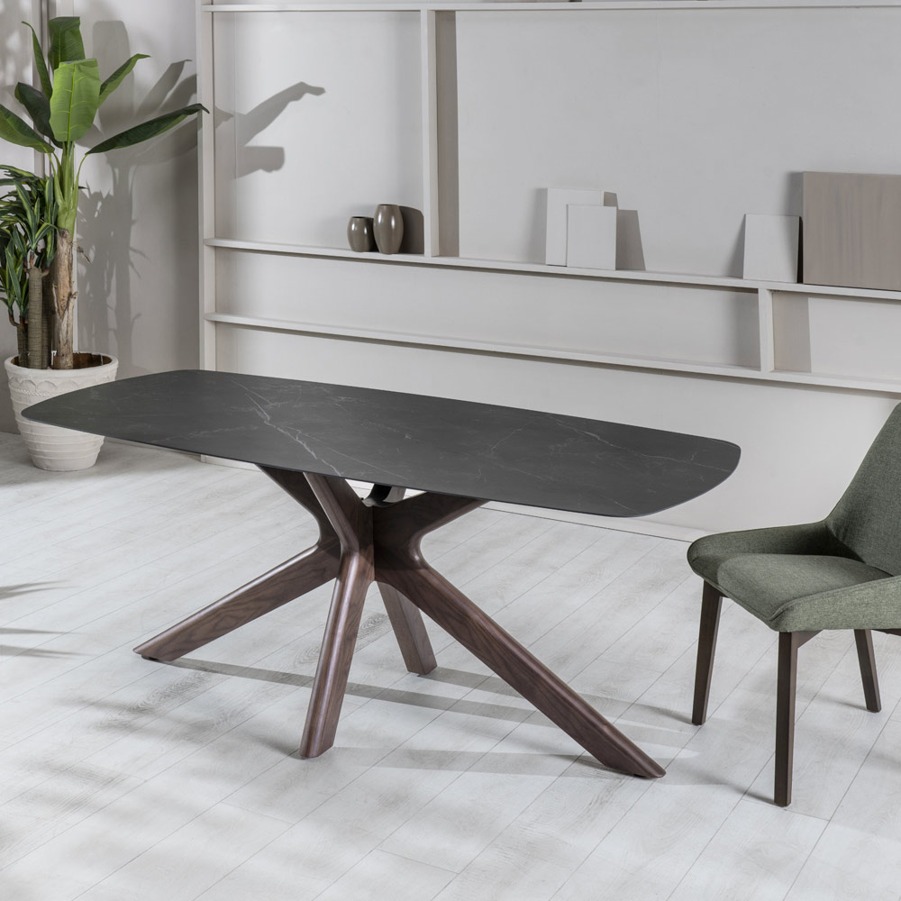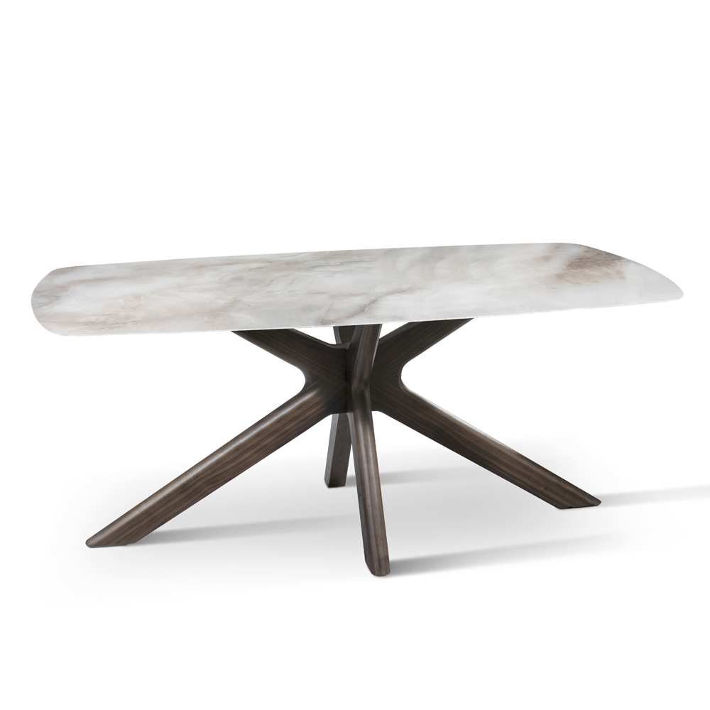 To wyrafinowany i oryginalny stół, w którym płynne i miękkie linie bawią się ze sobą, tworząc detale o dużej sile wizualnej. Ceramiczny blat delikatnie spoczywa na podstawie w kształcie gwiazdy, wykonanej z litego drewna orzechowego. Wynik badań eksplorujących najróżniejsze style i inspiracje, jest prawdziwym bohaterem strefy dziennej, harmonijnie pasującym zarówno do środowisk o nowoczesnym designie, jak i do przestrzeni sprzyjających luksusowi i klasycznemu stylowi.