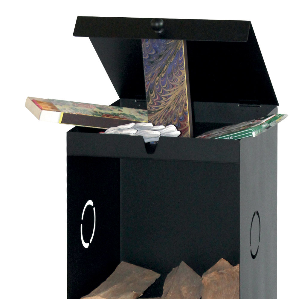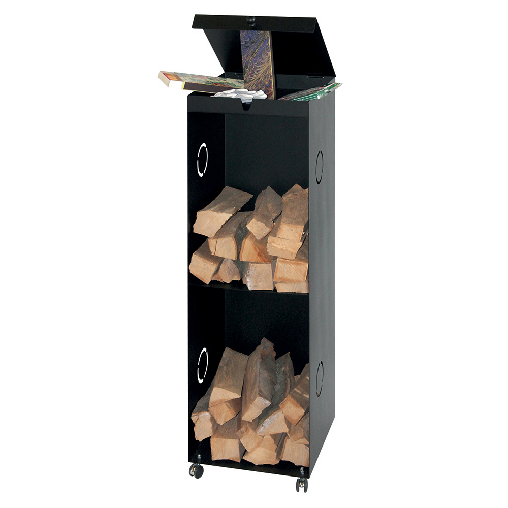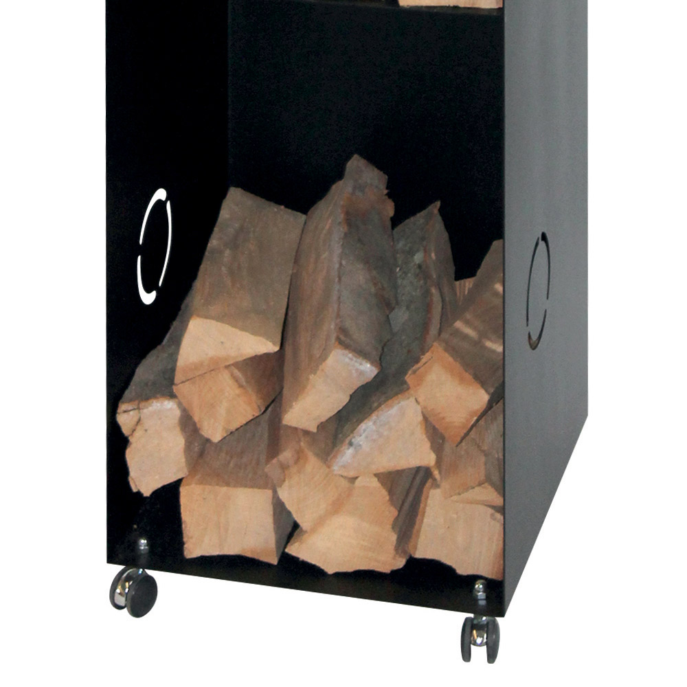 Ten pionowy stojak na polana jest funkcjonalnym i wszechstronnym stylistycznie dodatkiem do każdego kominka. Smukła czarna metalowa konstrukcja, wyposażona w koła , zapewnia wygodę poruszania się i oszczędność miejsca, a jednocześnie zapewnia przestronne rozwiązanie do przechowywania drewna. Górny otwór służy do przechowywania podpałek lub innych drobnych akcesoriów, natomiast otwarte przegródki pozwalają uporządkować drewno i mieć je zawsze pod ręką. Prosty, a zarazem elegancki design pasuje do każdego wnętrza, od rustykalnego po nowoczesne.