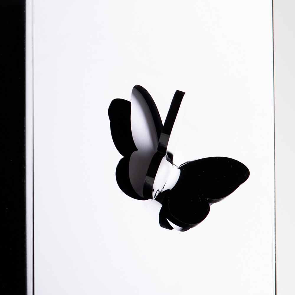 Stojak na parasole z czarnej pleksi charakteryzuje się przedstawieniem znakowanych laserowo zimowych gałęzi i trójwymiarowych zdobionych motyli oraz podstawy ze stali nierdzewnej.