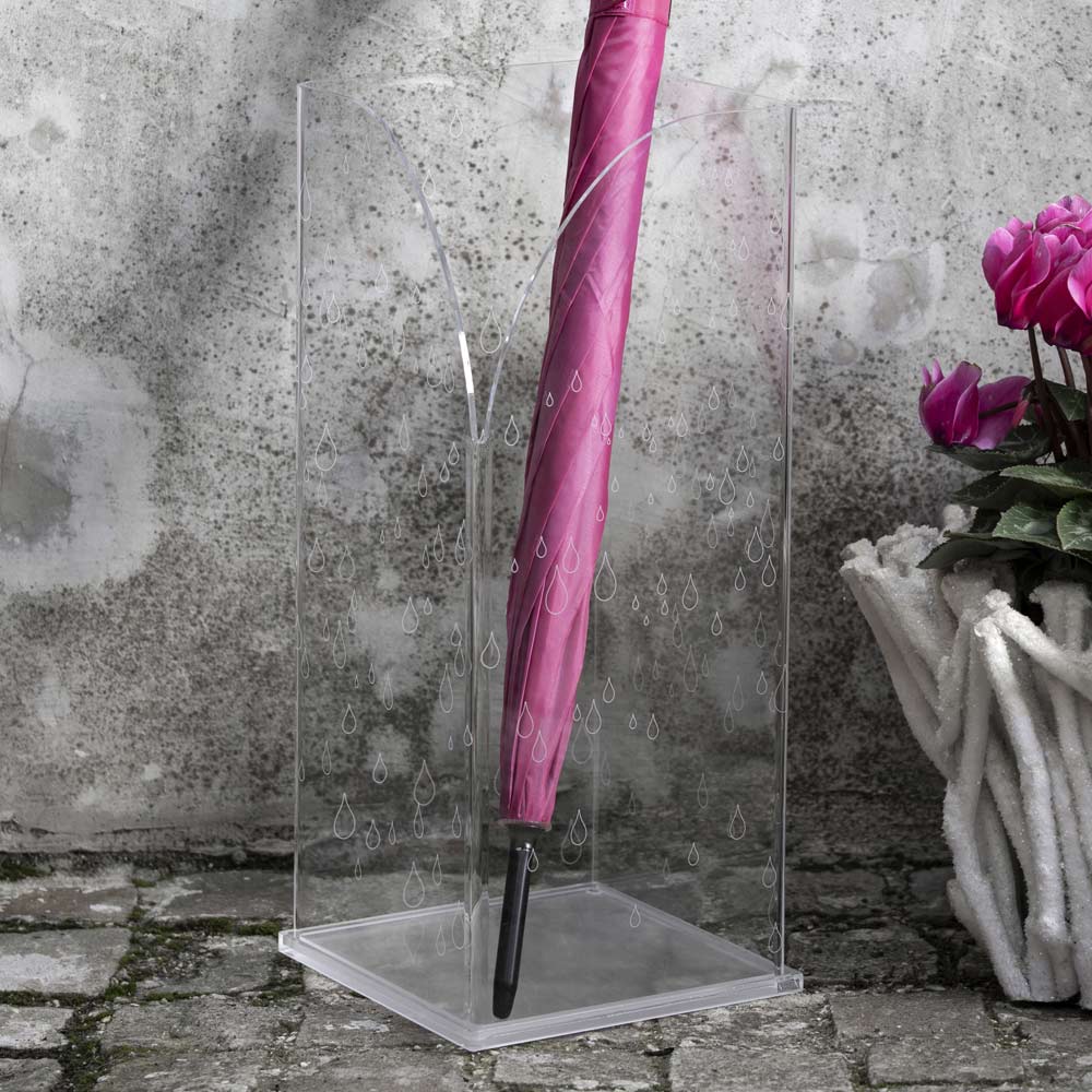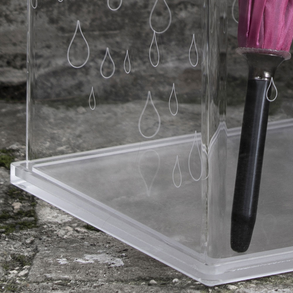 Ten prostokątny stojak na parasole posiada konstrukcję w całości wykonaną z przeźroczystego akrylu oszlifowanego kryształem i wygrawerowanym laserowo zdobieniami przedstawiającymi kropelki wody, dla grubości 3 mm i 10 mm dla podstawy.