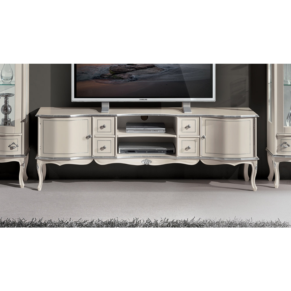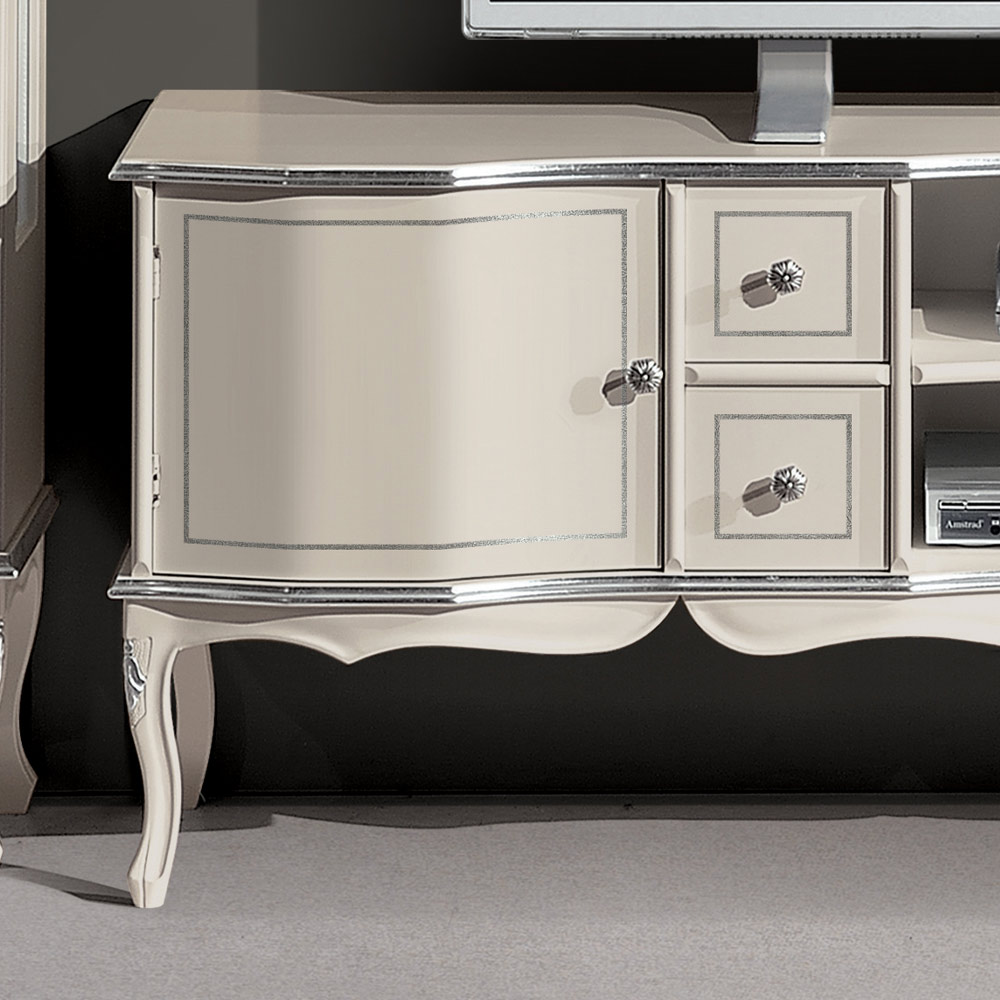 Klasyczny stolik RTV do salonu z 2 drzwiami, 4 szufladami i 2 przegródkami. Styl i kunszt wykonania, które charakteryzują ten luksusowy mebel, wychodzą na jaw w tym eleganckim meblu wykonanym z szlachetnego białego drewna ze srebrnymi detalami . To wyrafinowany dodatek, który podkreśli charakter wnętrza. W całości wykonany we Włoszech i ręcznie przez doświadczonych mistrzów rzemiosła , charakteryzuje się kunsztem i elegancją. Produkcja odbywa się z wysokiej jakości materiałów , a całość jest wykonywana ręcznie , z najwyższą starannością i profesjonalizmem, co wyróżnia produkty Made in Italy .