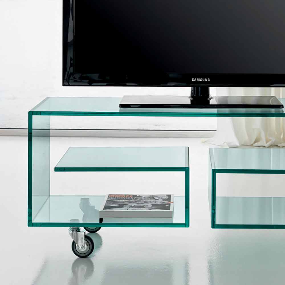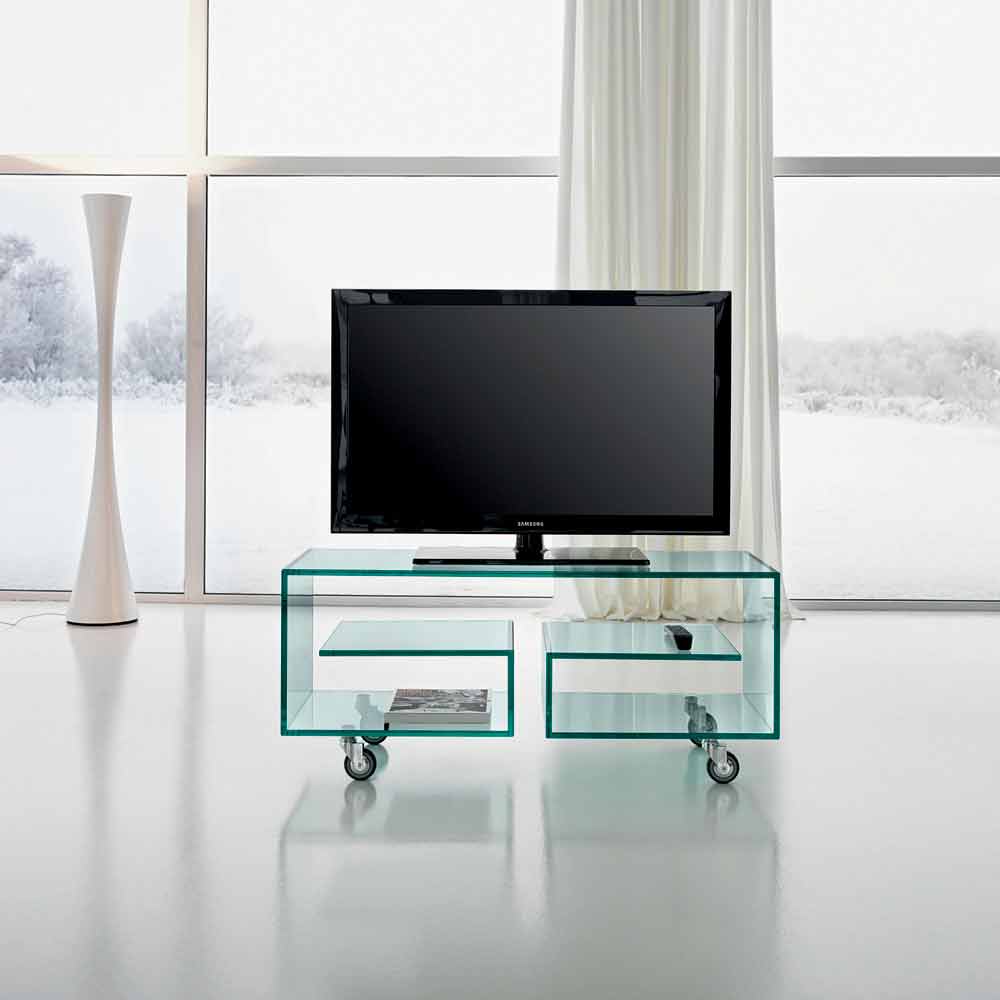 Szafka RTV do salonu charakteryzuje się rzeźbiarskim i oryginalnym designem w całości wykonanym z przezroczystego szkła o grubości 15 mm.