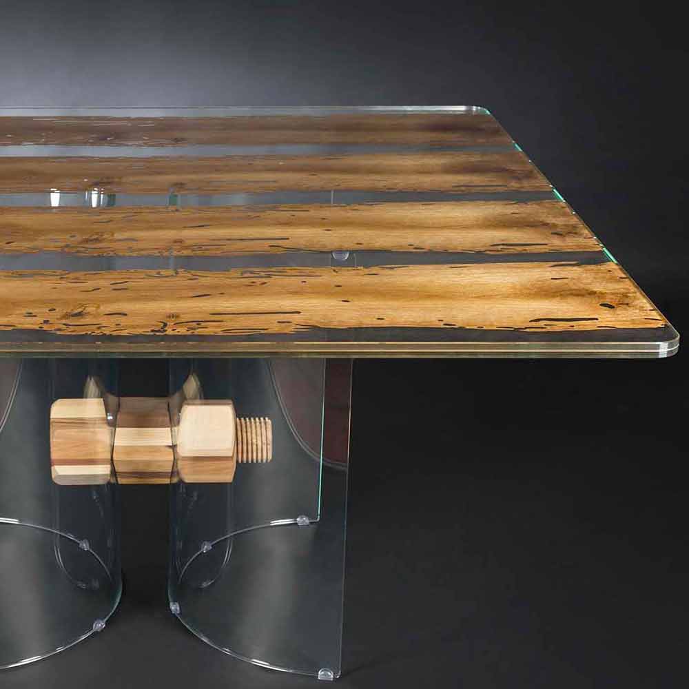 Stół wykonany z dwóch warstw szkła 10+10 mm, między nimi znajduje się cieńka warstwa briccola wood z dębu.