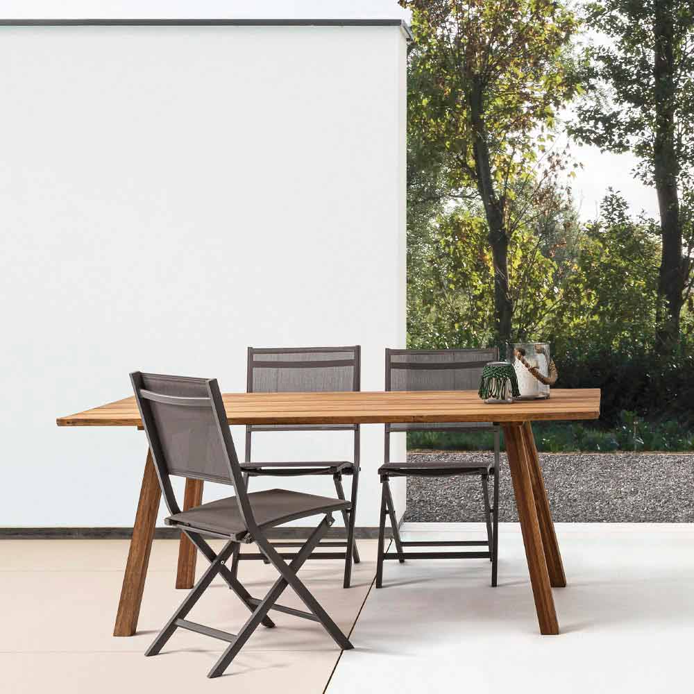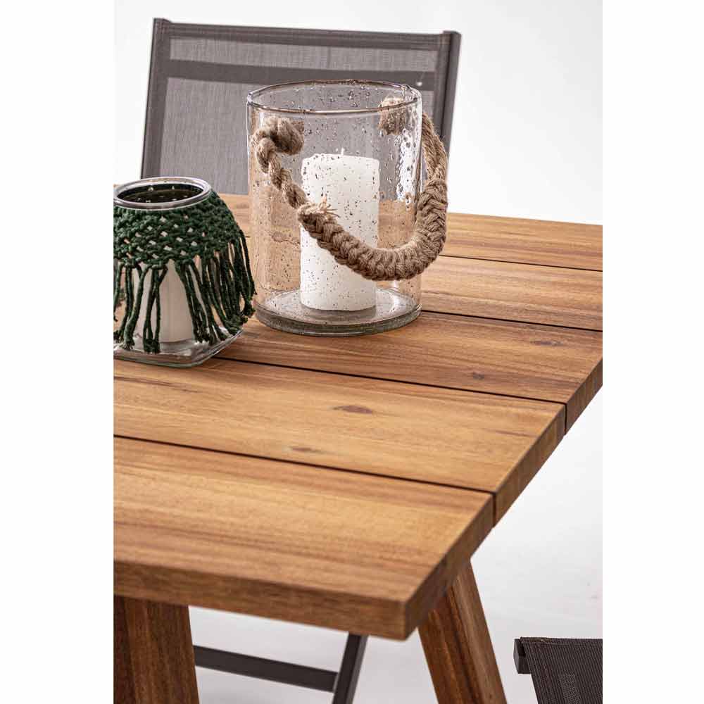 Struktura w 100% z drewna akacjowego. wykończenie olejowe. Śruby ze stali ocynkowanej. Listwy boczne w oryginalnych sekcjach bagażnika. Nogi do złożenia.