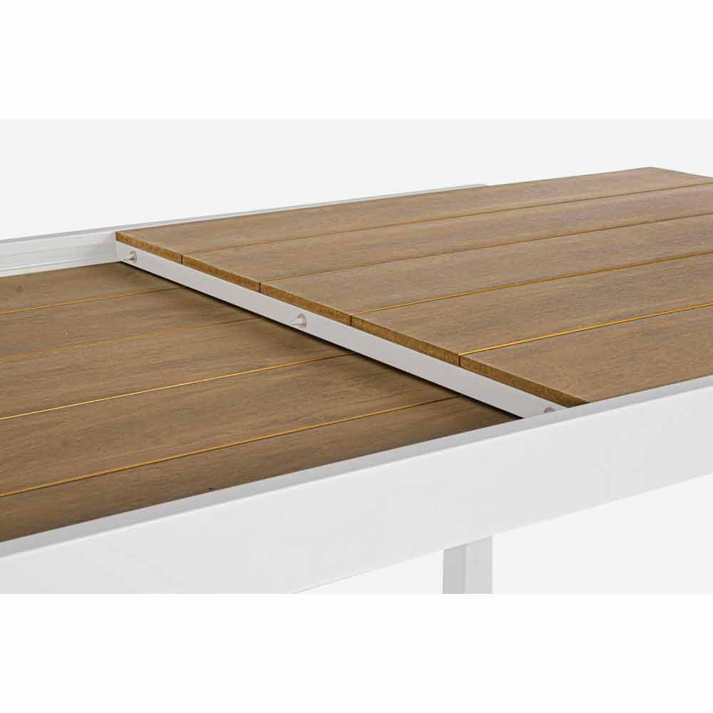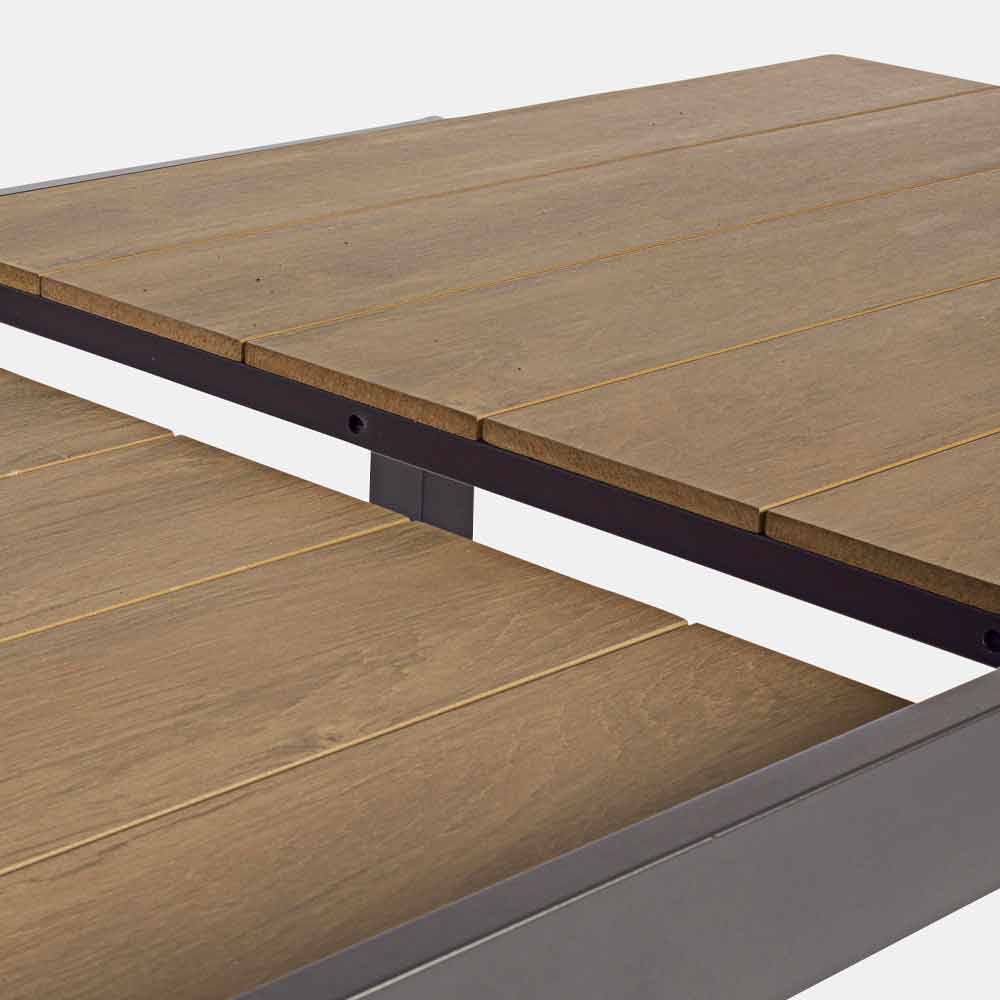 Blat z polywood (materiał kompozytowy o wyglądzie podobnym do drewna) 90% styropian 10% sbs kolor teak. Wysuwane przedłużenie. Śruby ze stali ocynkowanej.