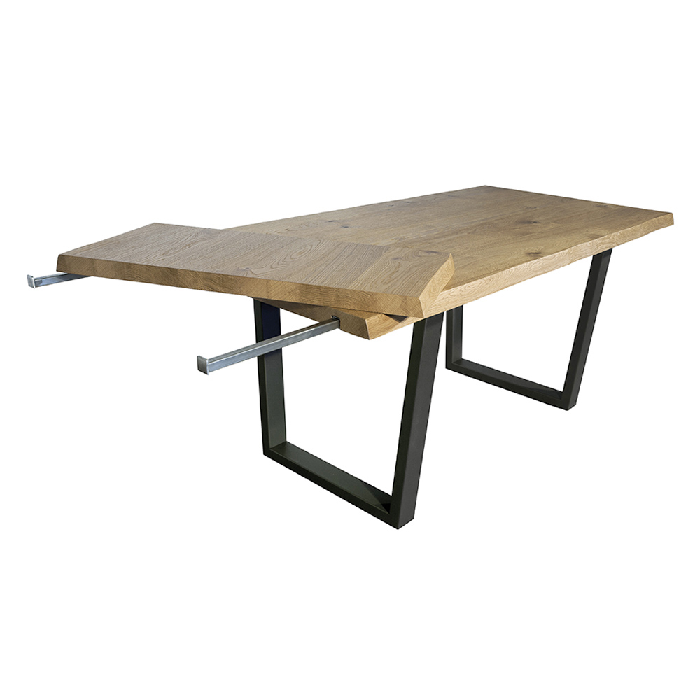 Drewniany stół pokryty fornirem dębowym sękanym i metalową podstawą Made in Italy.
