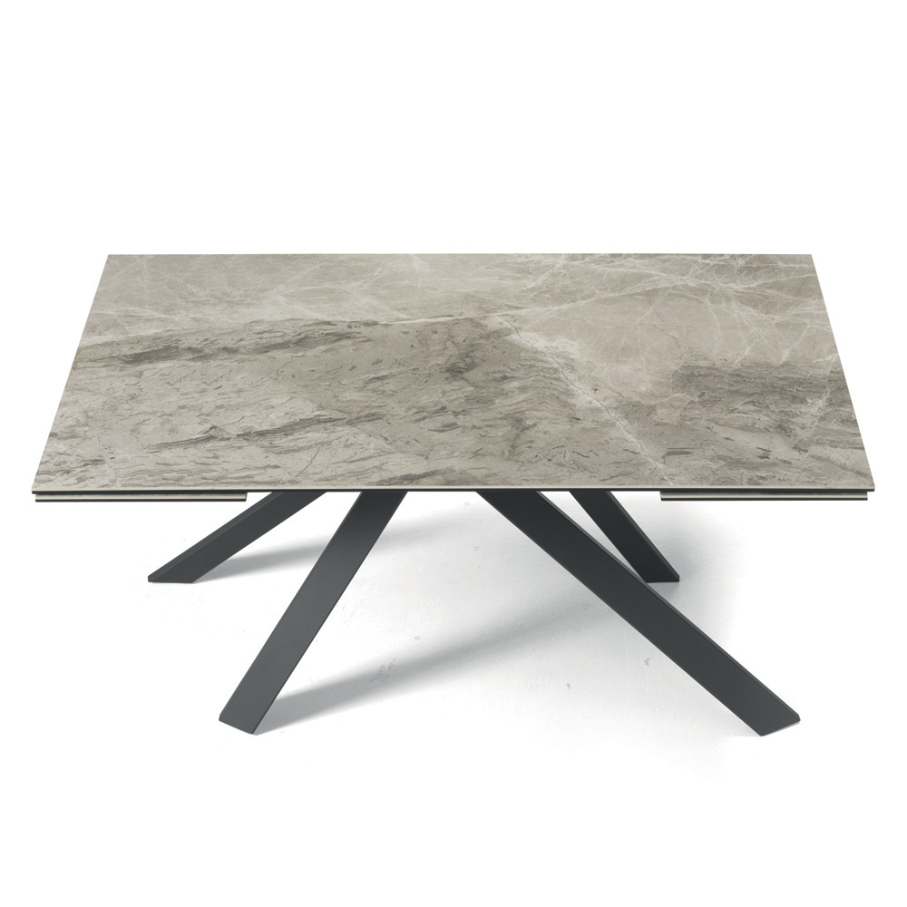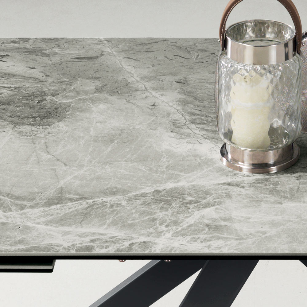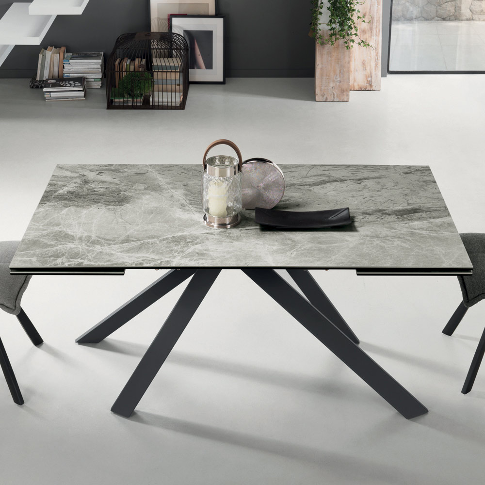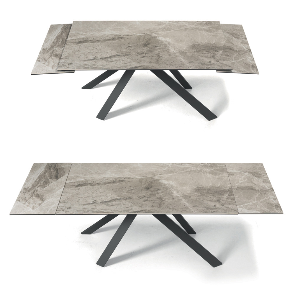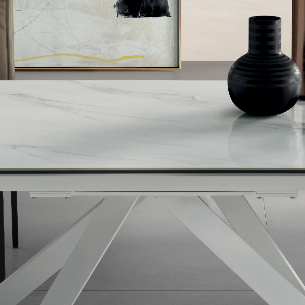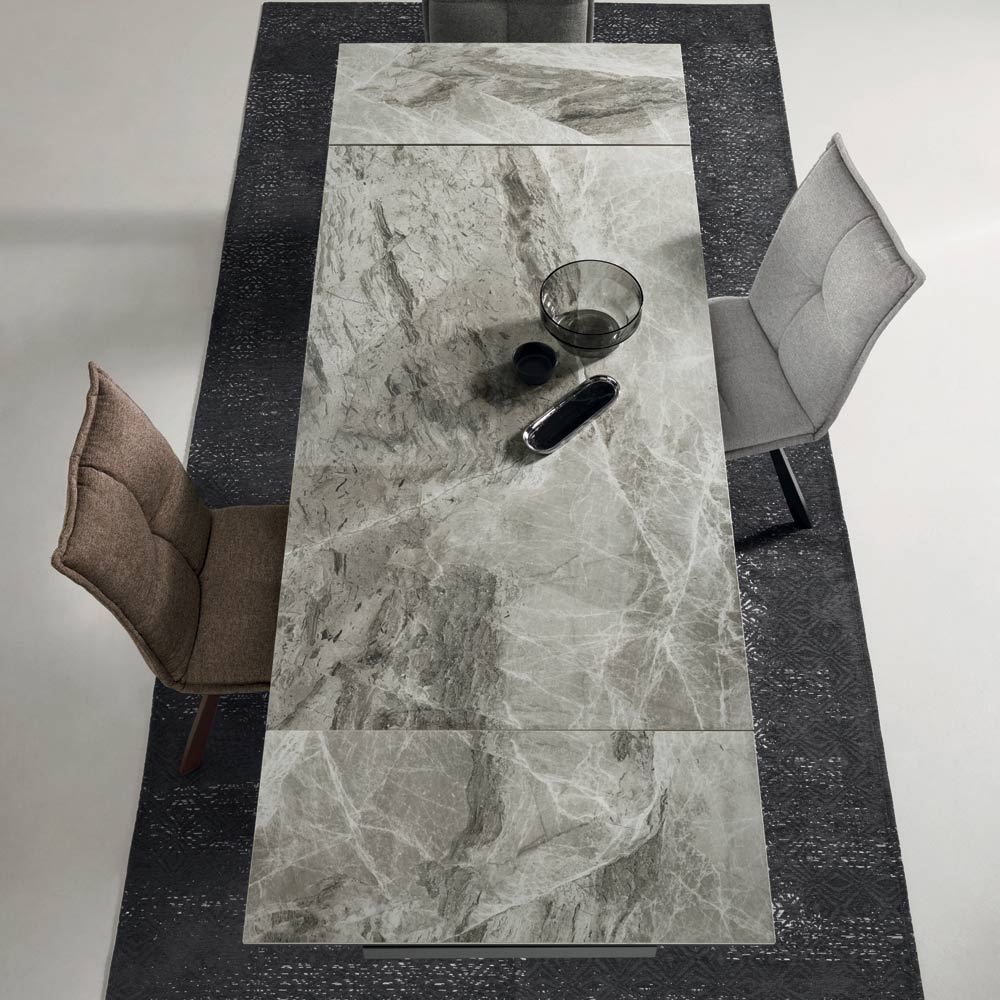 Stół do jadalni z blatem wykonanym z kamionki porcelanowej imitującej marmur, rozkładany do 240 cm dzięki dwóm dołączonym przedłużkom o długości 40 cm i malowanej metalowej konstrukcji. To produkt idealny dla tych, którzy uwielbiają organizować obiady i kolacje z przyjaciółmi, nie rezygnując przy tym ze stylu i elegancji.